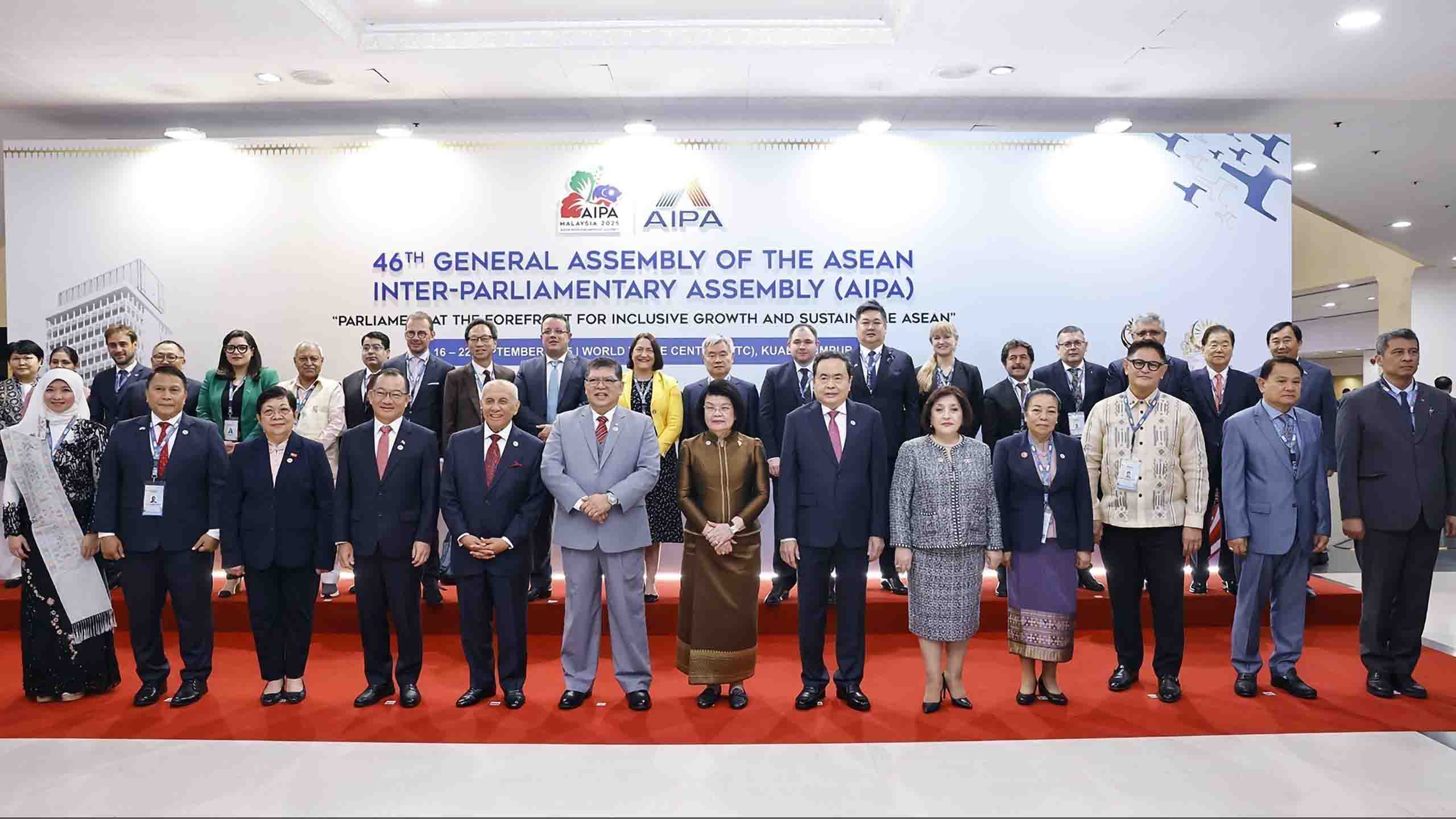 Председатель НС Чан Тхань Ман и главы парламтских делегаций стран-членов АИПА фотографируются на память с г-ном Джохари Абдулом, Председателем Палаты представителей Малайзии, Председателем АИПА-46. Фото: ВИА