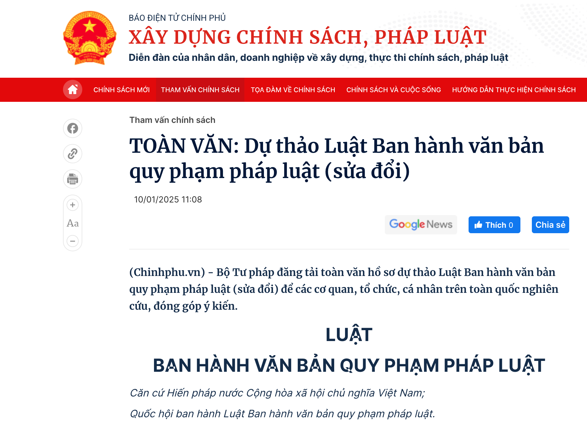 Thời gian qua, đề cương chi tiết dự thảo Luật Ban hành văn bản quy phạm pháp luật đã được đăng tải rộng rãi trên các phương tiện thông tin đại chúng cho thấy quyết tâm của Việt Nam trong việc đổi mới quy trình xây dựng pháp luật.