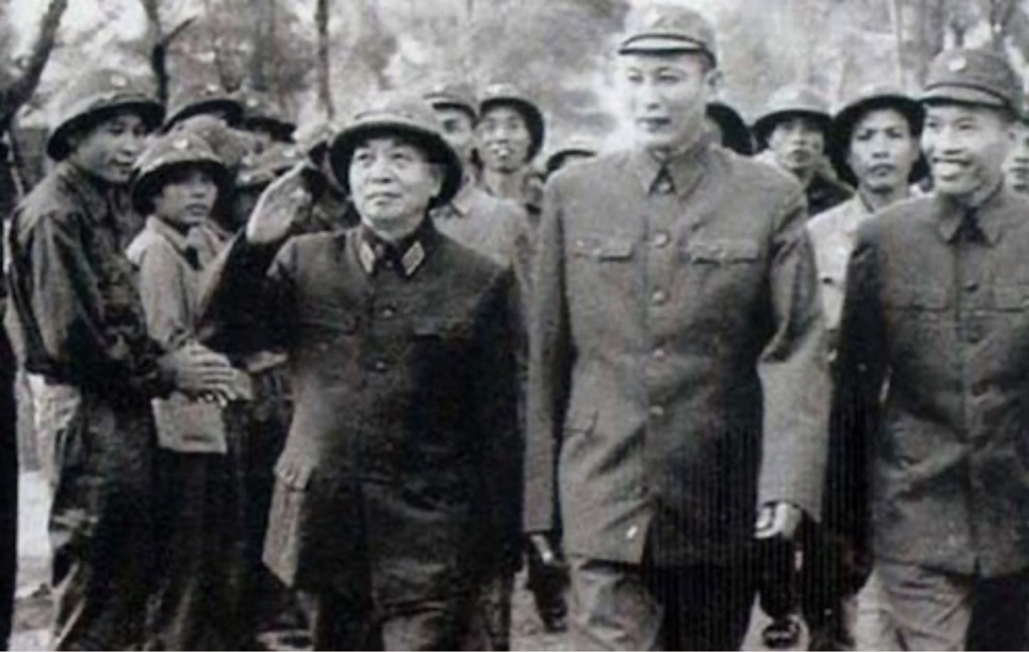 Đại tướng Võ Nguyên Giáp cùng Tư lệnh Binh đoàn Trường Sơn Đồng Sỹ Nguyên thăm bộ đội Trường Sơn.