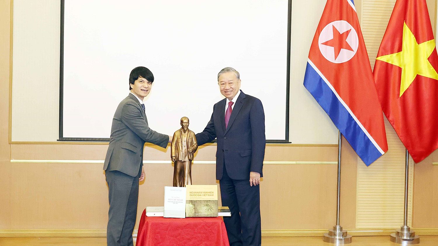 Le secrétaire général du PCV, To Lam, offre une statue du Président Ho Chi Minh et des livres à l'ambassade du Vietnam en RPDC. Photo : VNA.