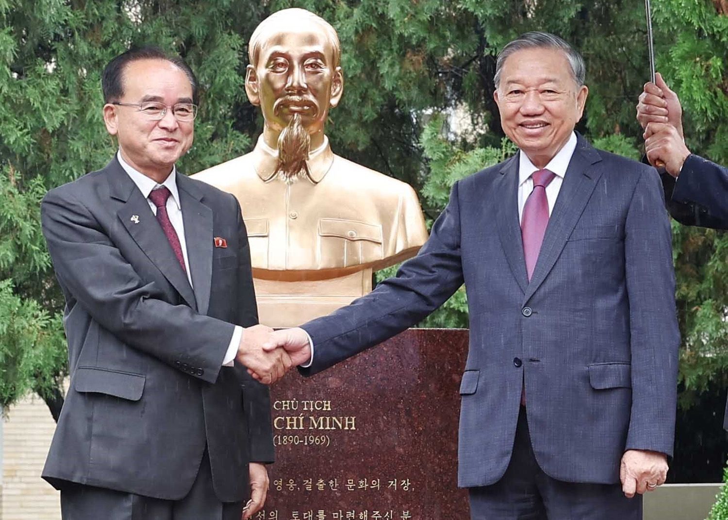 Le secrétaire général du PCV, To Lam, et Jo Yong Won, membre du présidium du Bureau politique, secrétaire du Comité central du Parti et chef du Département d'organisation et d'orientation du Parti du Travail de Corée, à la cérémonie d'inauguration de la statue du Président Ho Chi Minh dans l’enceinte de l’ambassade du Vietnam à Pyongyang. Photo : VNA.