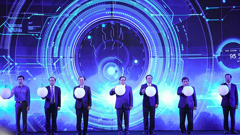 Thủ tướng Phạm Minh Chính và lãnh đạo TPHCM, các bộ, ngành, Đoàn TNCS Hồ Chí Minh thực hiện nghi thức Dấu ấn Ngày hội Khởi nghiệp đổi mới sáng tạo quốc gia và Tuần lễ Đổi mới sáng tạo khởi nghiệp TPHCM 2023.