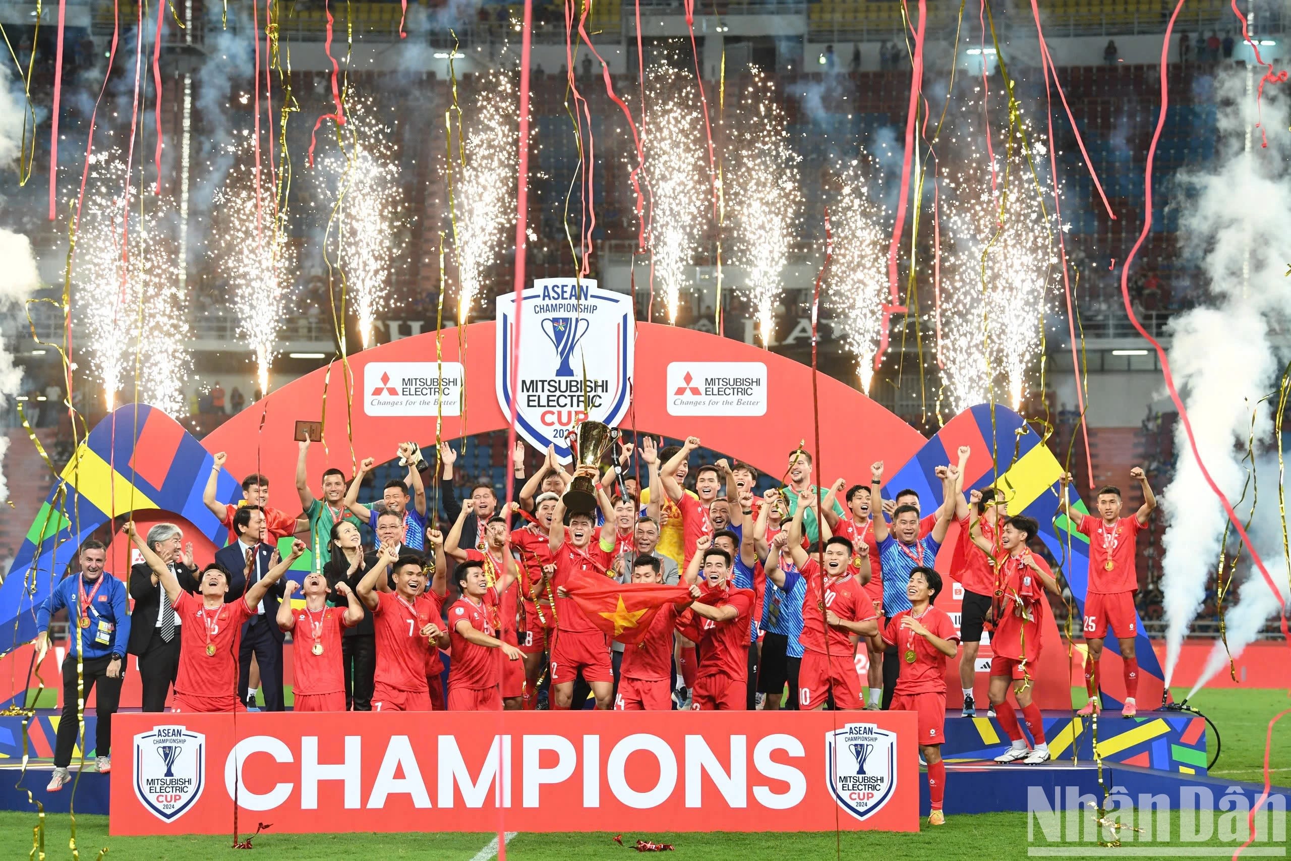 越南队与泰国队进行2024年东南亚足球锦标赛决赛第二回合,越南队3-2取胜,两场比赛总比分5-3第三次加冕冠军。(成达 摄)
