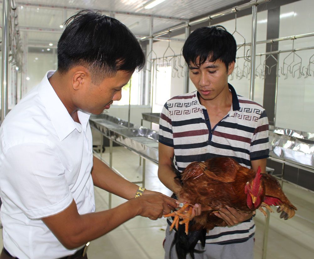 Anh Cường (phải) gắn gắn đai, có tem truy xuất nguồn gốc cho gà tại HTX Nông nghiệp Xanh Yên Thế