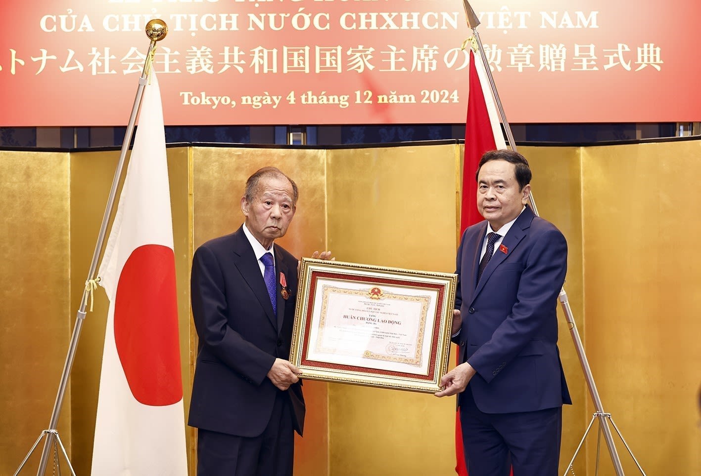 Le président de l’Assemblée nationale, Tran Thanh Man, a remis l’Ordre du Travail de troisième classe, décerné par le Président vietnamien, à M. Nikai Toshihiro, président de l’Alliance parlementaire d’amitié Japon-Vietnam. Photo : VNA.