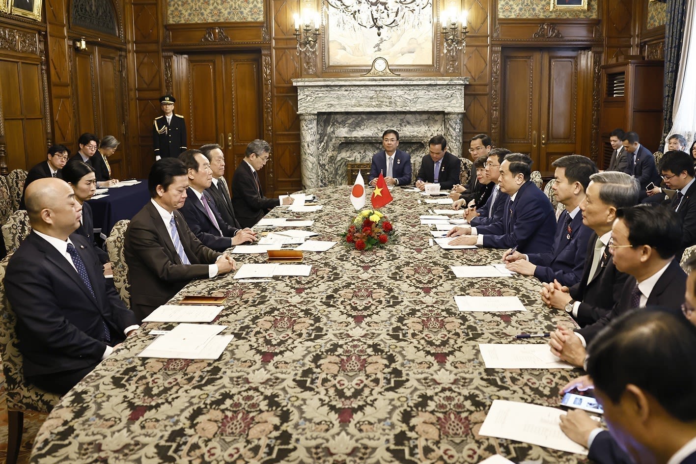 Chủ tịch Quốc hội Trần Thanh Mẫn tiếp Chủ tịch Điều hành Hội đồng thúc đẩy ngoại giao nhân dân Nhật Bản. (Ảnh: TTXVN)