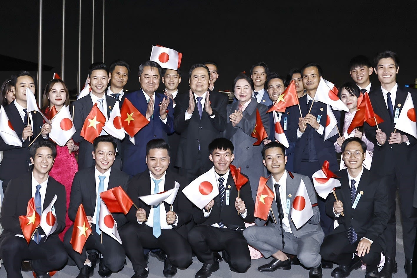 Cán bộ, nhân viên Đại sứ quán và đại diện kiều bào Việt Nam tại Nhật Bản đón Chủ tịch Quốc hội Trần Thanh Mẫn và Phu nhân tại Sân bay Haneda. (Ảnh: TTXVN)
