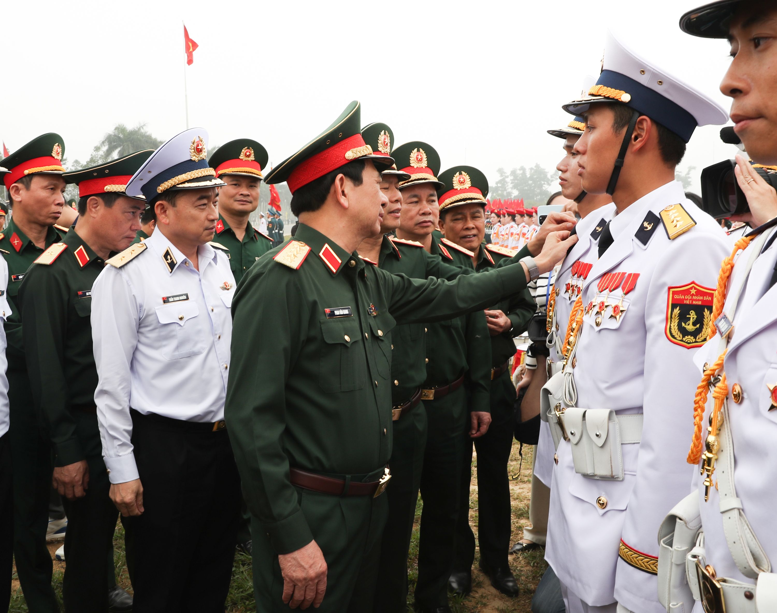 Phó Đô đốc Trần Thanh Nghiêm kiểm tra lễ tiết tác phong khối sĩ quan Hải quân luyện tập diễu binh, diễu hành. (Ảnh: Vũ Hưởng)