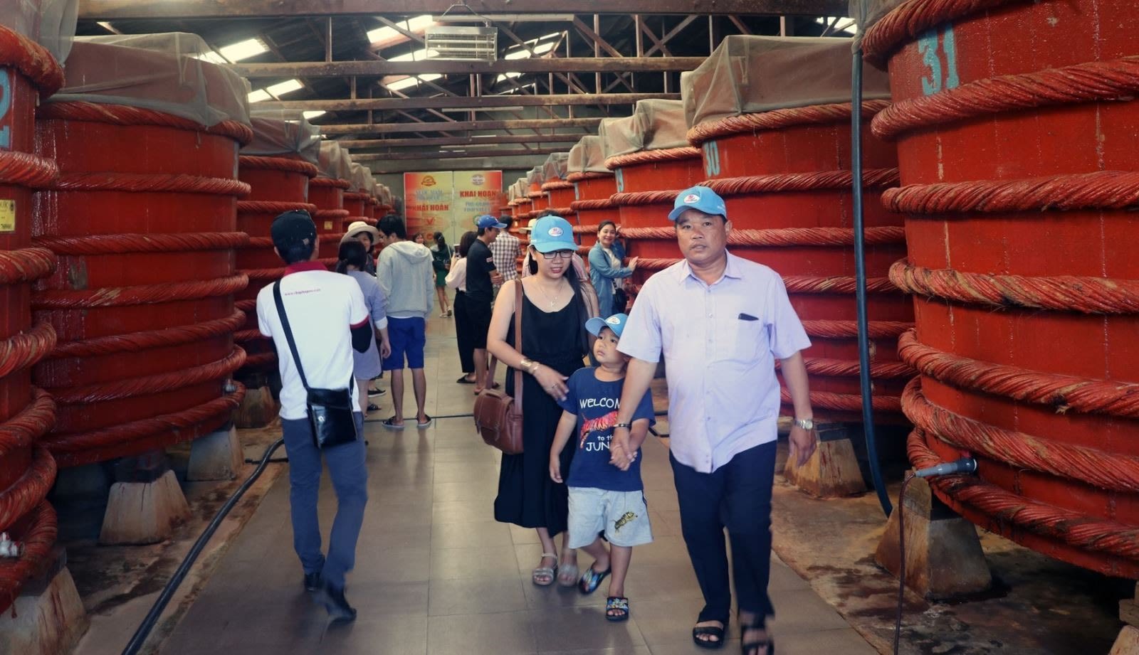 Khách du lịch tham quan khu sản xuất nước mắm tại Nhà thùng nước mắm Khải Hoàn trên đảo Phú Quốc (Kiên Giang). Ảnh: TTXVN