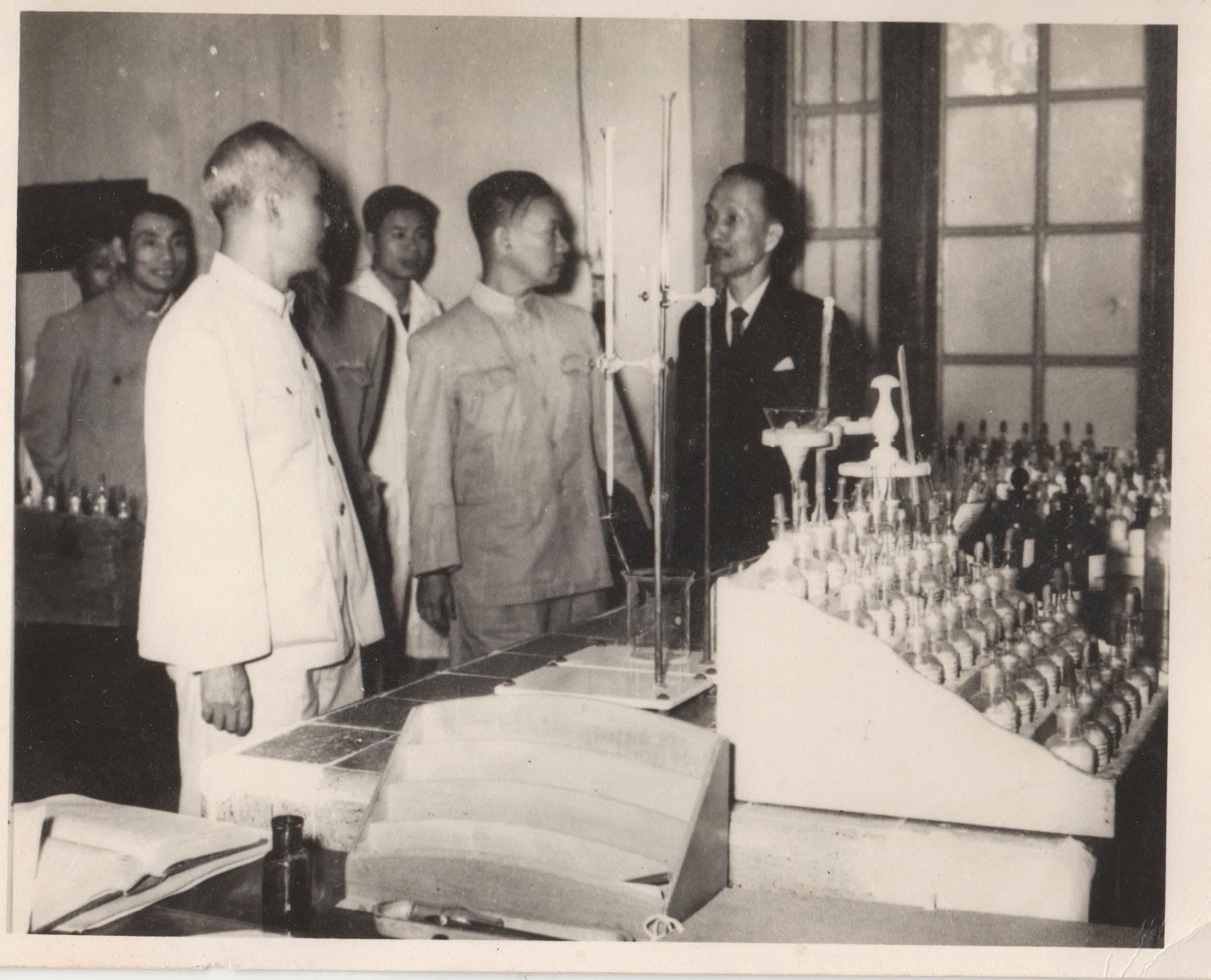 Giáo sư Hồ Dắc Di (bên phải) tiếp đón Chủ tịch Hồ Chí Minh và Bộ trưởng Giáo dục Nguyễn Văn Huyên tới thăm Trường đại học Y. (Ảnh tư liệu)