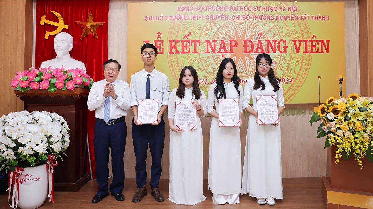 Nhân kỷ niệm 134 năm Ngày sinh Chủ tịch Hồ Chí Minh (19/5/1890-19/5/2024), chiều 17/5/2024, Chi bộ Trường THPT Chuyên và Chi bộ trường Nguyễn Tất Thành thuộc Đảng bộ Trường đại học Sư phạm Hà Nội tổ chức lễ kết nạp Đảng cho 8 quần chúng ưu tú là học sinh của hai trường. Ảnh: TTXVN