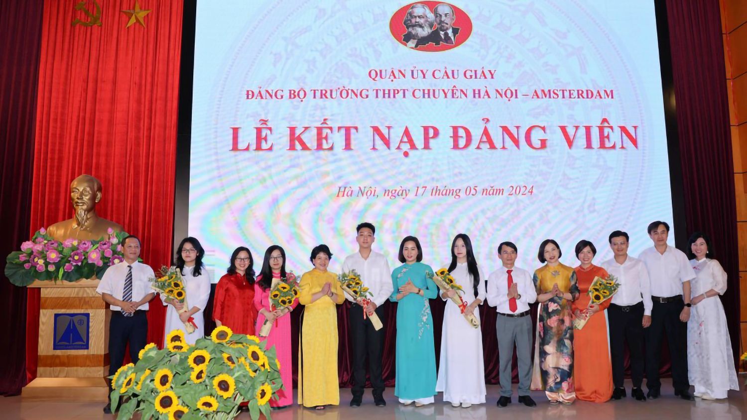 Đảng bộ Trường THPT chuyên Hà Nội - Amsterdam tổ chức lễ kết nạp Đảng cho 5 quần chúng ưu tú (gồm: 3 học sinh và 2 giáo viên), ngày 17/5/2024. Ảnh: Hn-ams.edu.vn