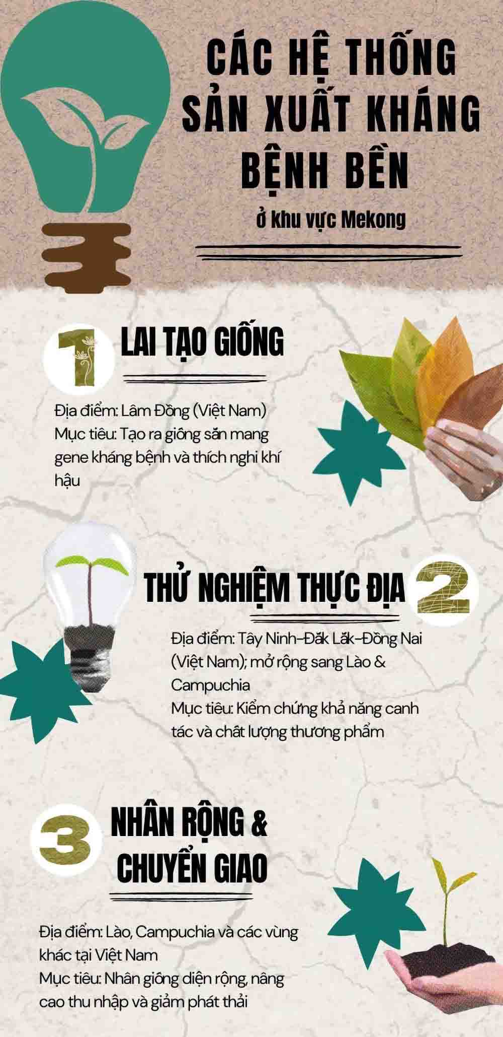 - Mục tiêu: Phát triển các dòng giống sắn mới có khả năng kháng bệnh, năng suất cao, thích ứng khí hậu nhằm bảo vệ sinh kế nông dân, giảm phát thải trong nông nghiệp và hướng đến phát triển bền vững.