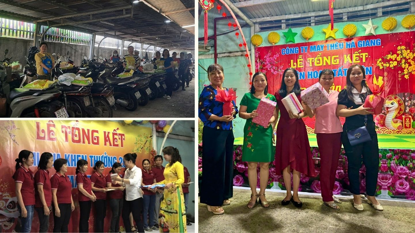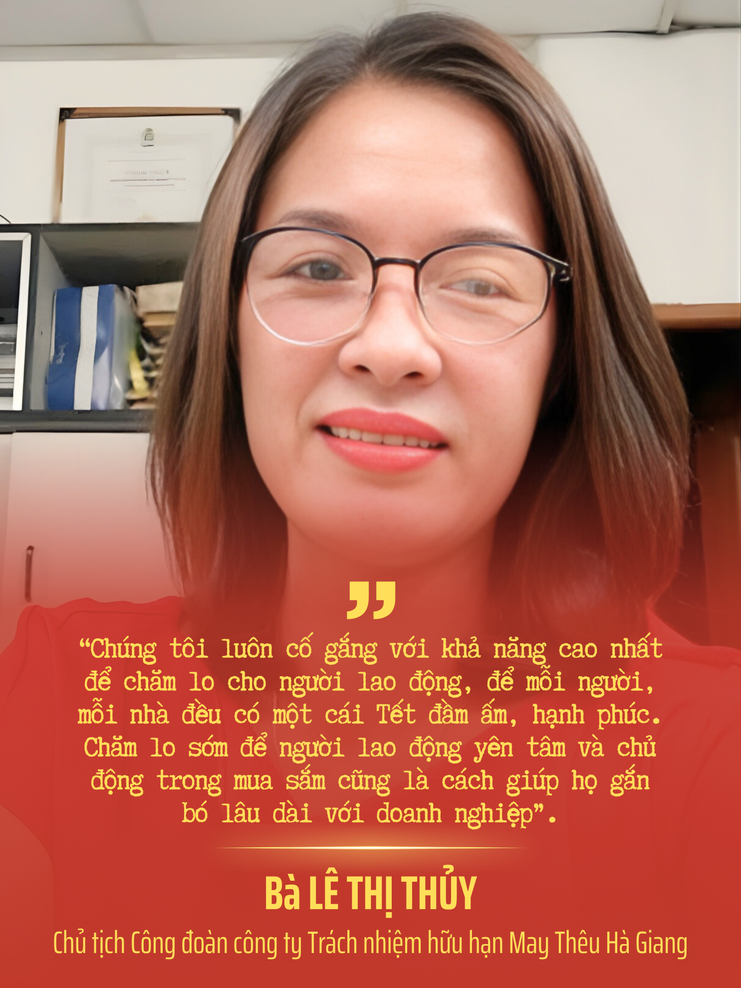 Công đoàn công ty Trách nhiệm hữu hạn May Thêu Hà Giang, cho biết, năm nay công ty tiếp tục duy trì mức chăm lo cao, từ lương tháng 13, thưởng cho người lao động xuất sắc, đến tổ chức tất niên và tặng quà Tết trị giá 600.000 đồng/người, cùng 10 kg gạo ST25 cho mỗi đoàn viên.