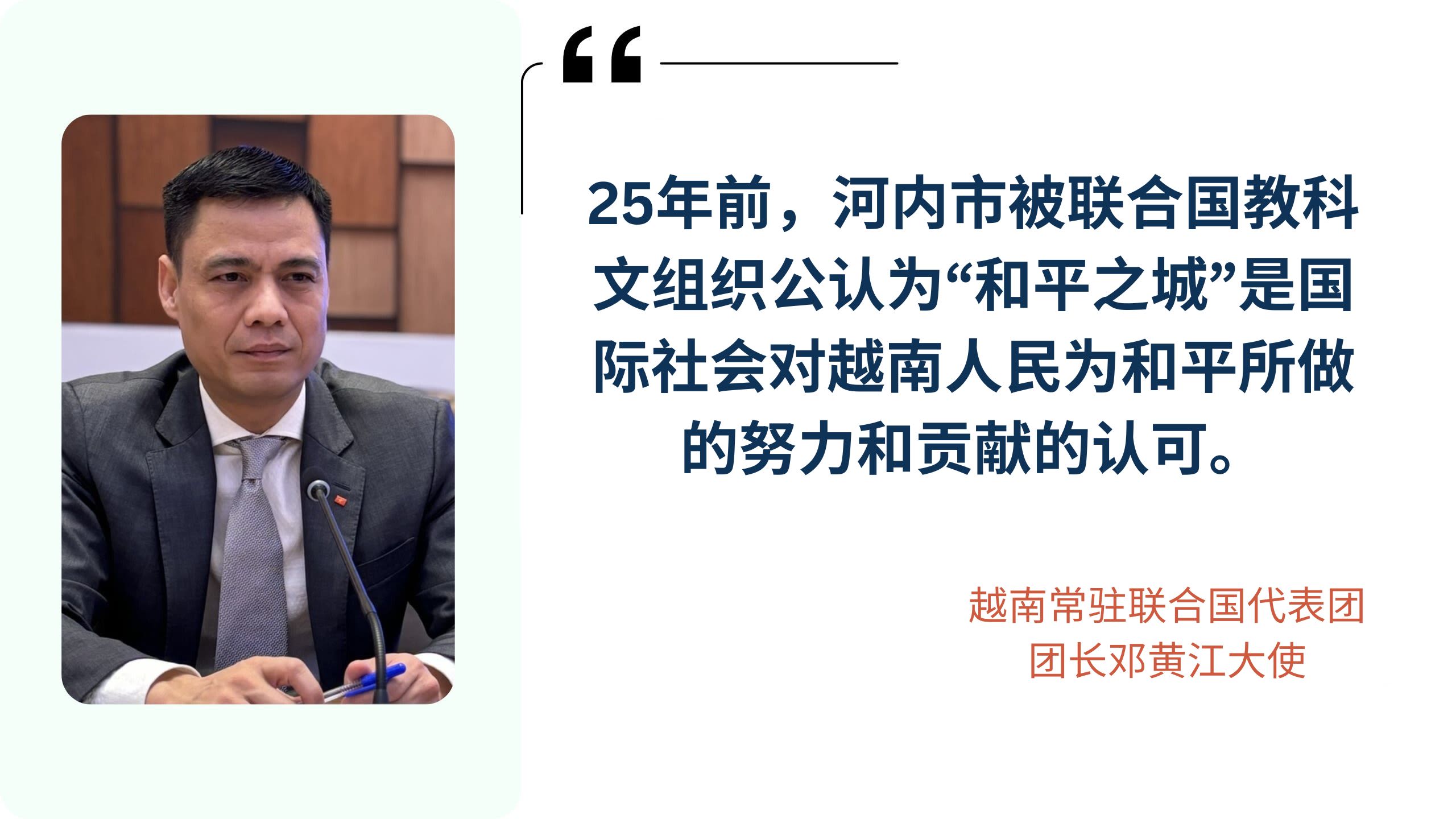 近期,越南常驻联合国代表团团长邓黄江大使8月2日在题为“为今世后代发展和平文化”的高级别论坛上强调,25年前,河内市荣获联合国教科文组织公认为“和平之城”是国际社会对越南人民为和平所做的努力和贡献的认可。