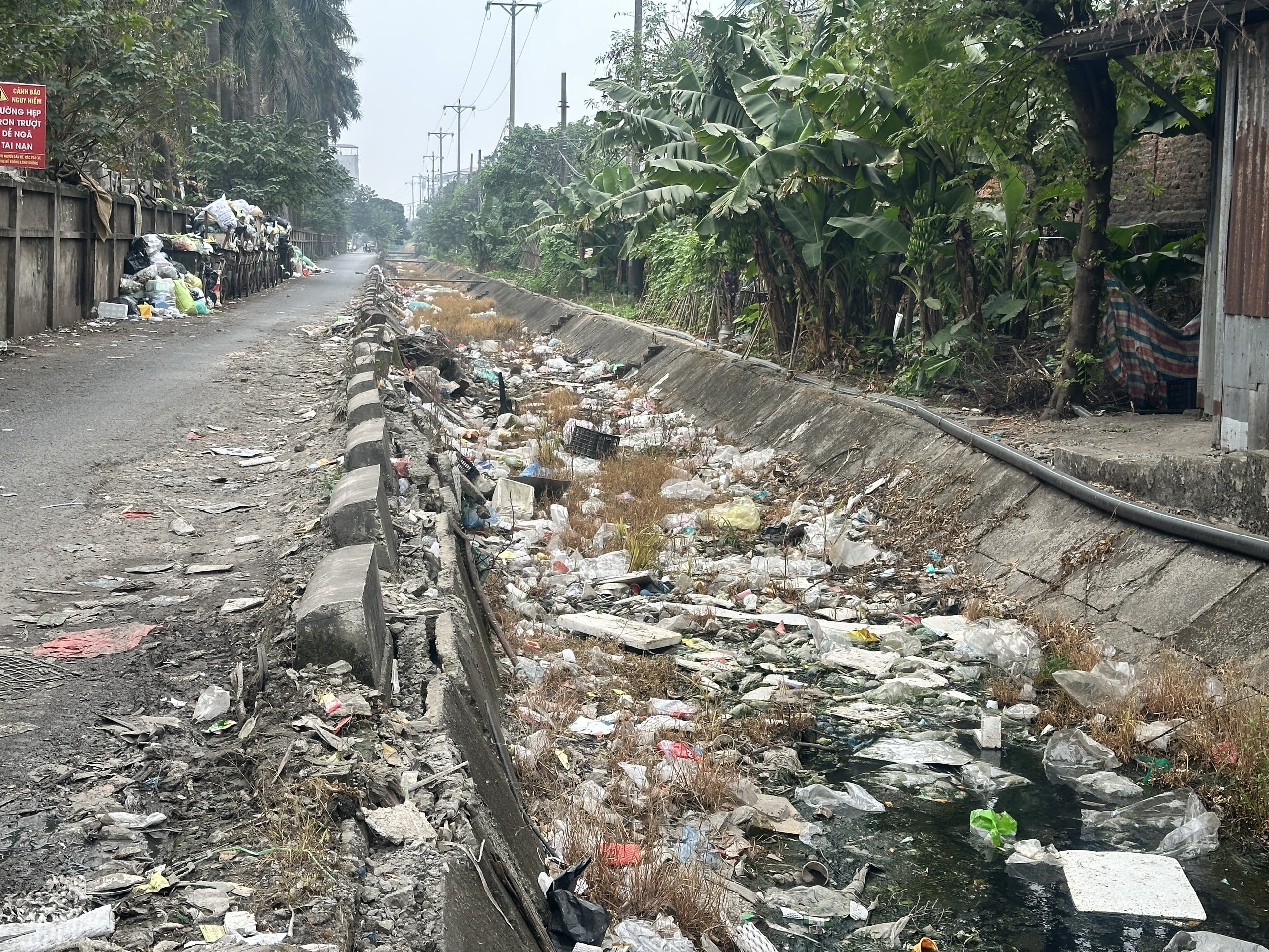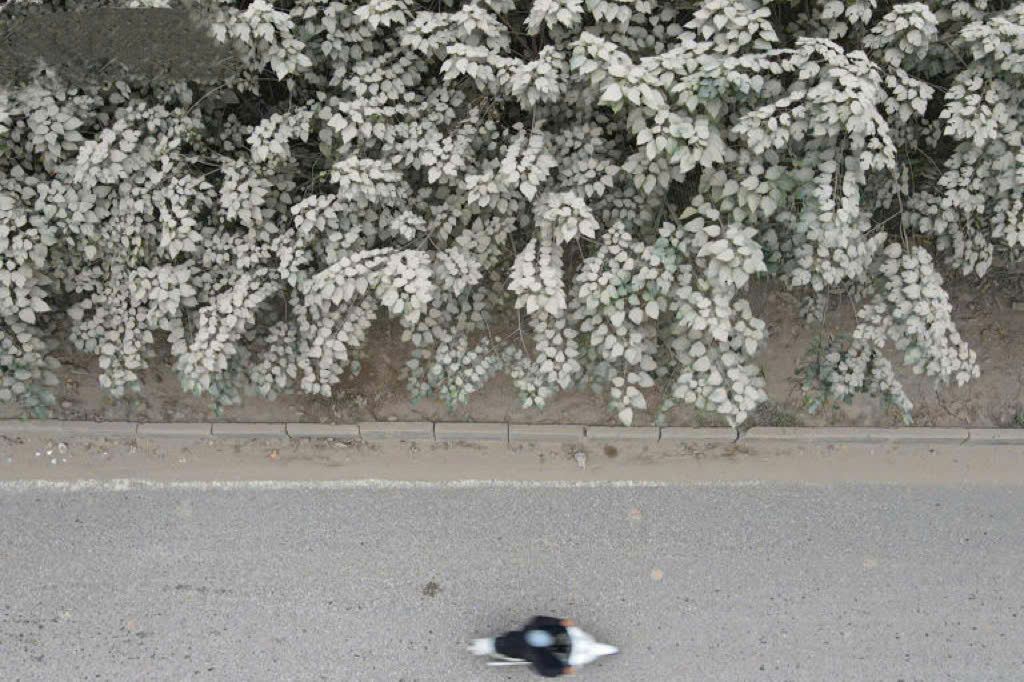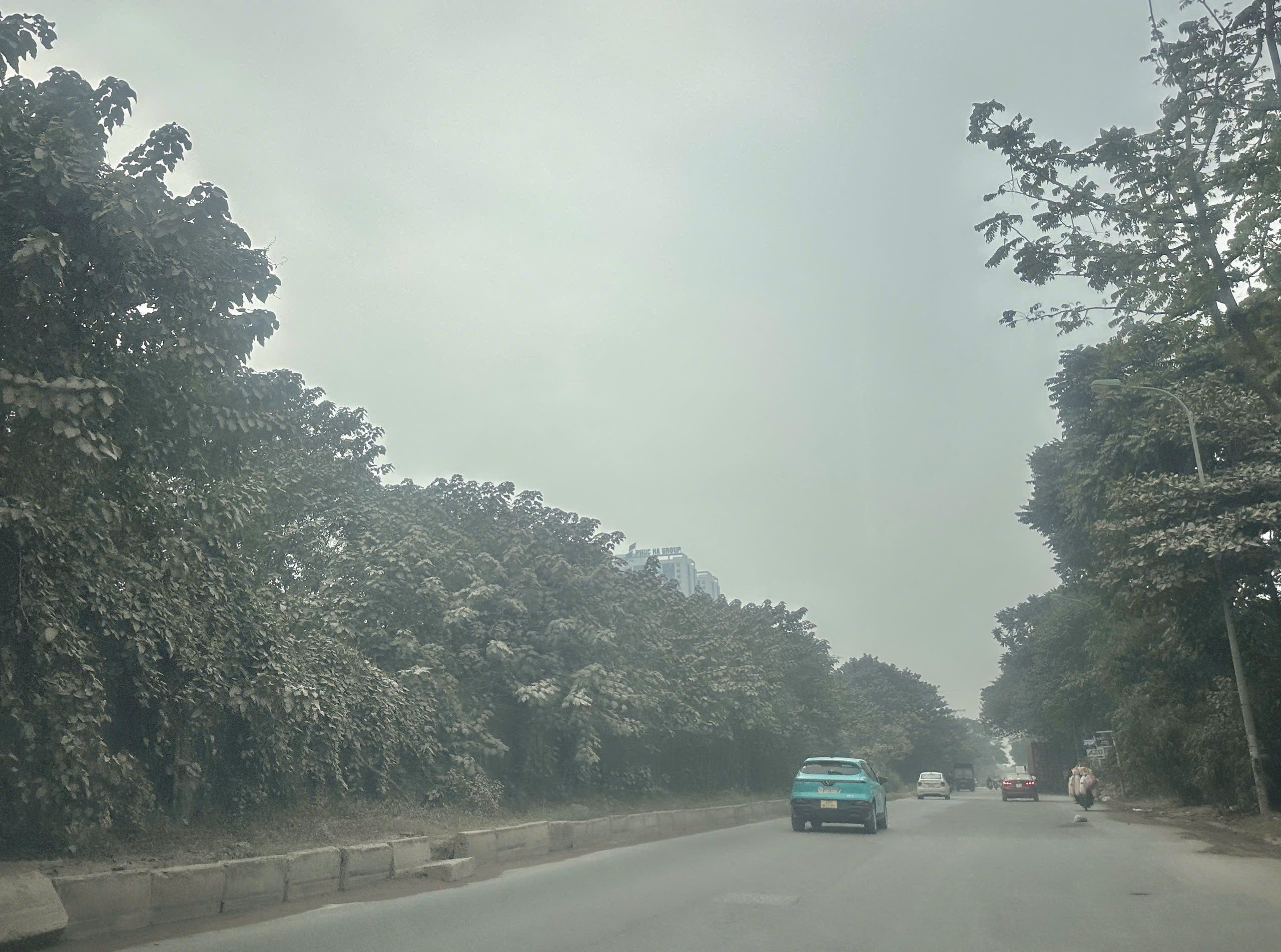 Tuyến đường gom Đại lộ Thăng Long (đoạn qua khu vực gần Thiên Đường Bảo Sơn) chìm trong lớp bụi dày đặc, mịt mù. Cây cối ven đường đổi sang màu trắng đục, phủ đầy lớp bột mịn. (Ảnh: THÙY LINH)