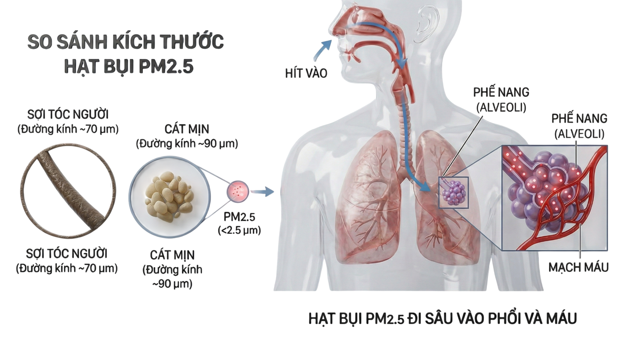 Tổ chức Y tế thế giới (WHO) cảnh báo, tiếp xúc thường xuyên với không khí ô nhiễm làm tăng mạnh nguy cơ viêm đường hô hấp cấp, COPD, hen suyễn, bệnh tim mạch, đột quỵ; đồng thời gây tổn thương da, mắt, hệ thần kinh, miễn dịch và thậm chí ảnh hưởng đến sức khỏe tâm thần.