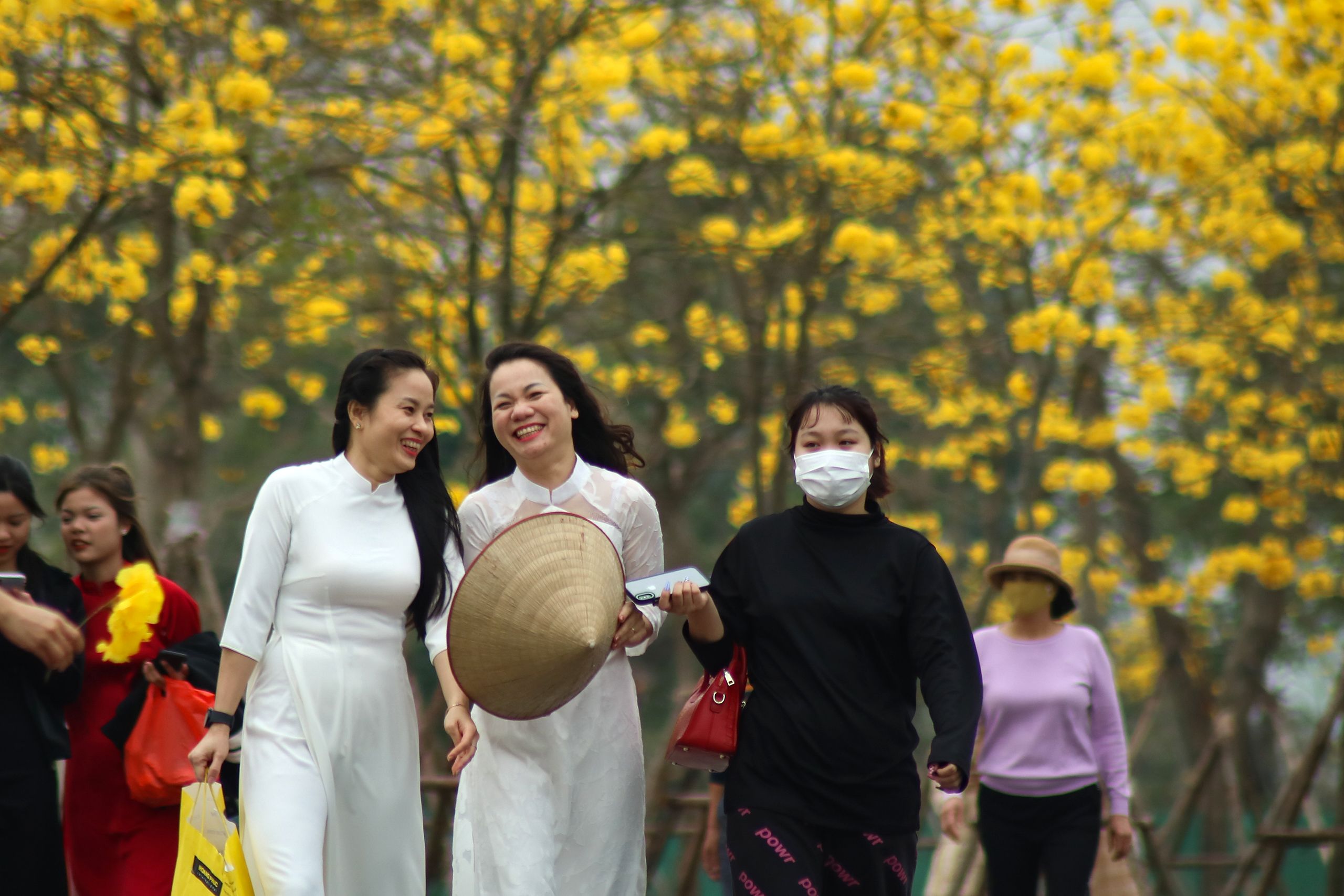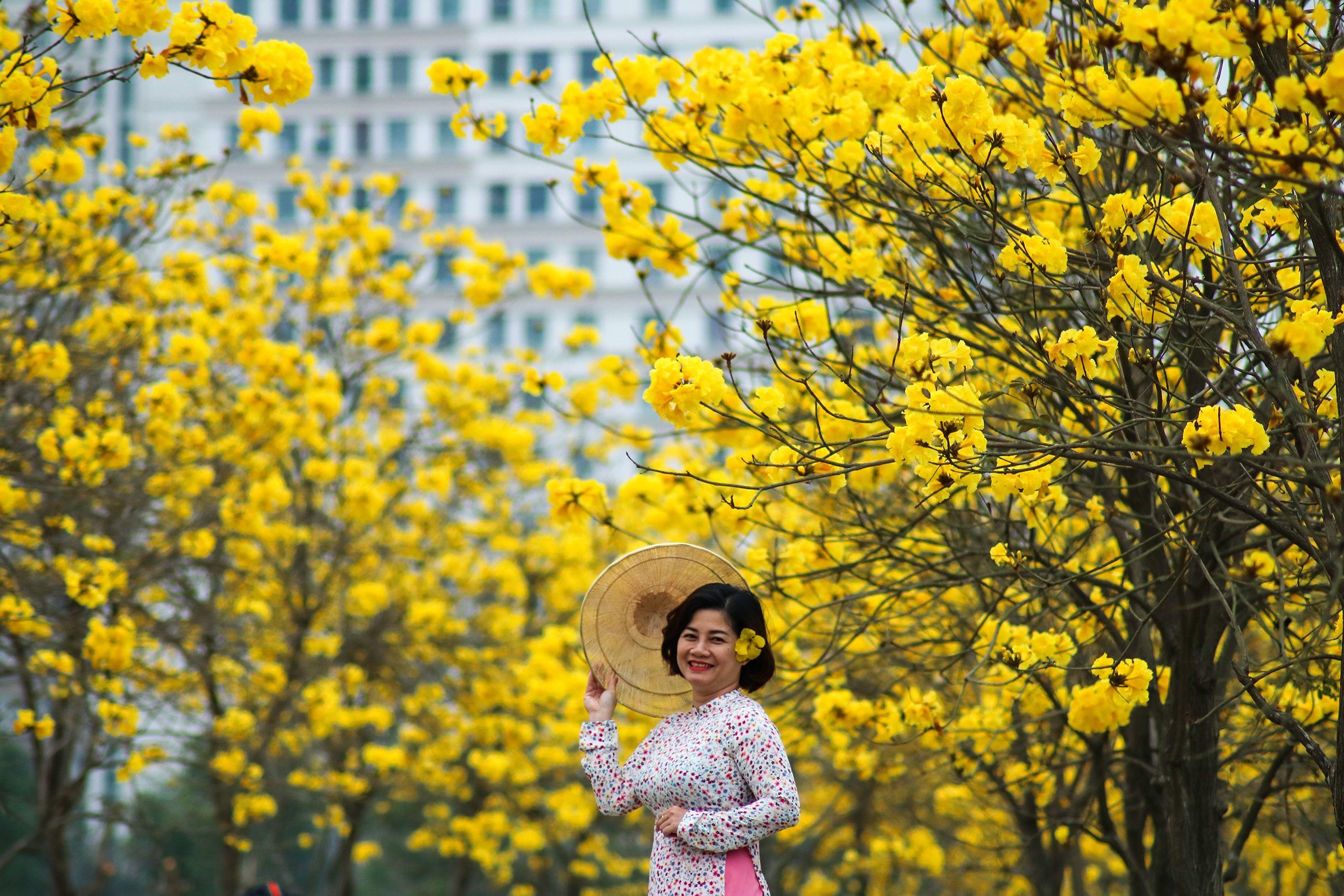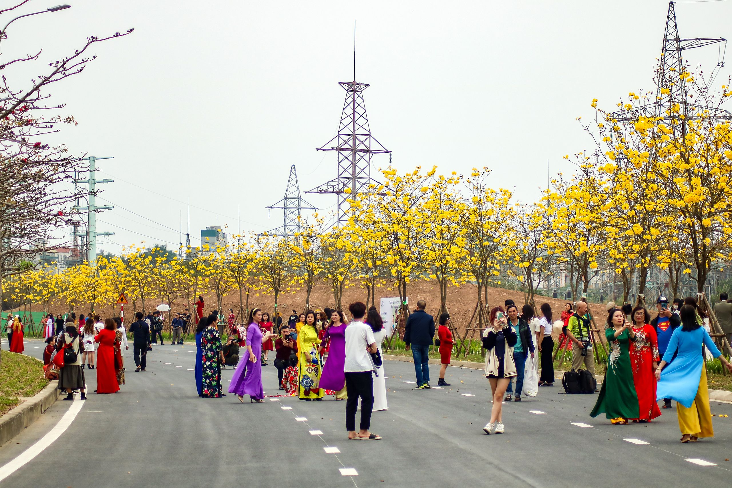 De nombreuses jeunes filles portant l’áo dài (tunique traditionnelle des femmes vietnamiennes) et des promeneurs viennent prendre des photos à côté des rangées d’arbres à trompette des Caraïbes en fleur.