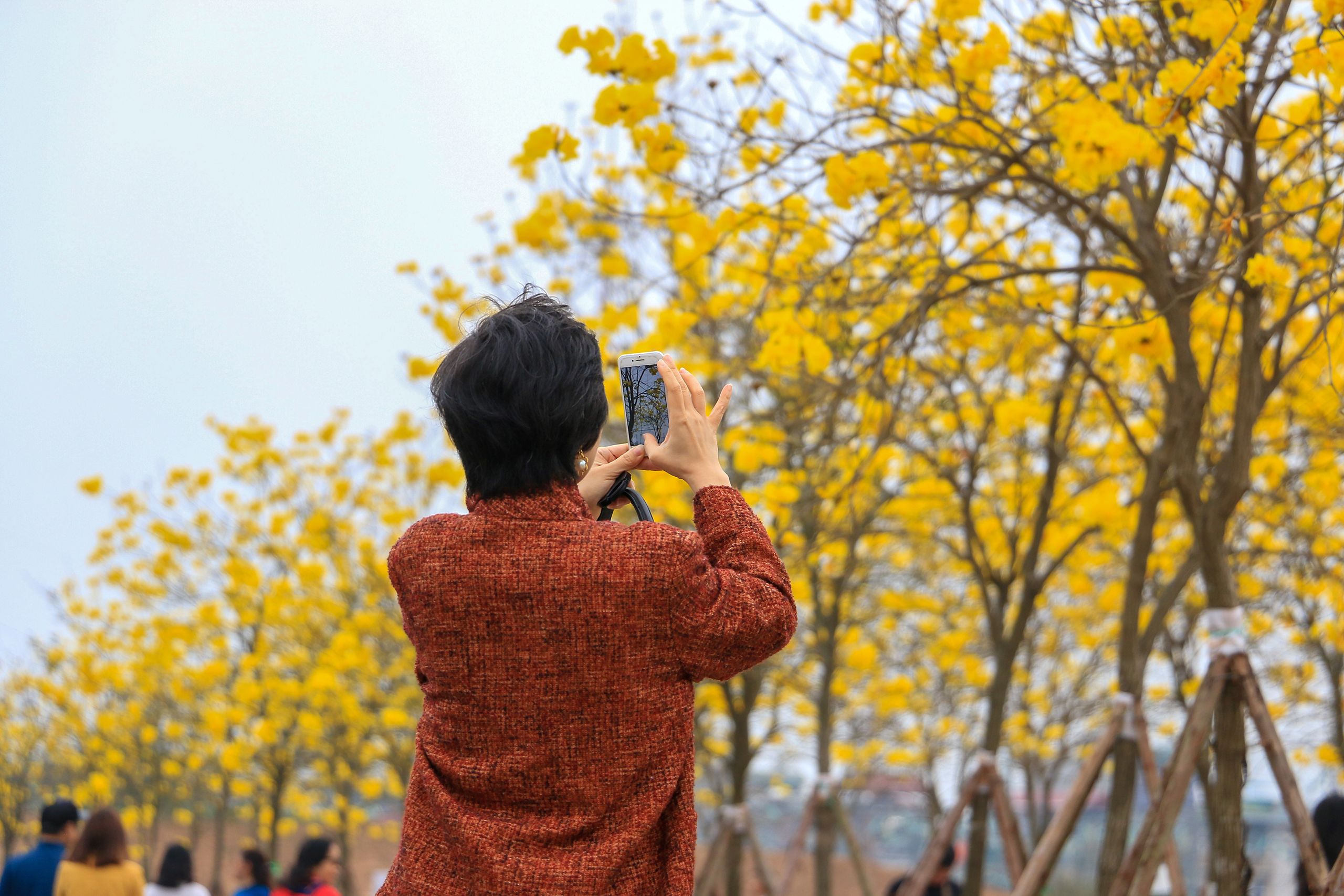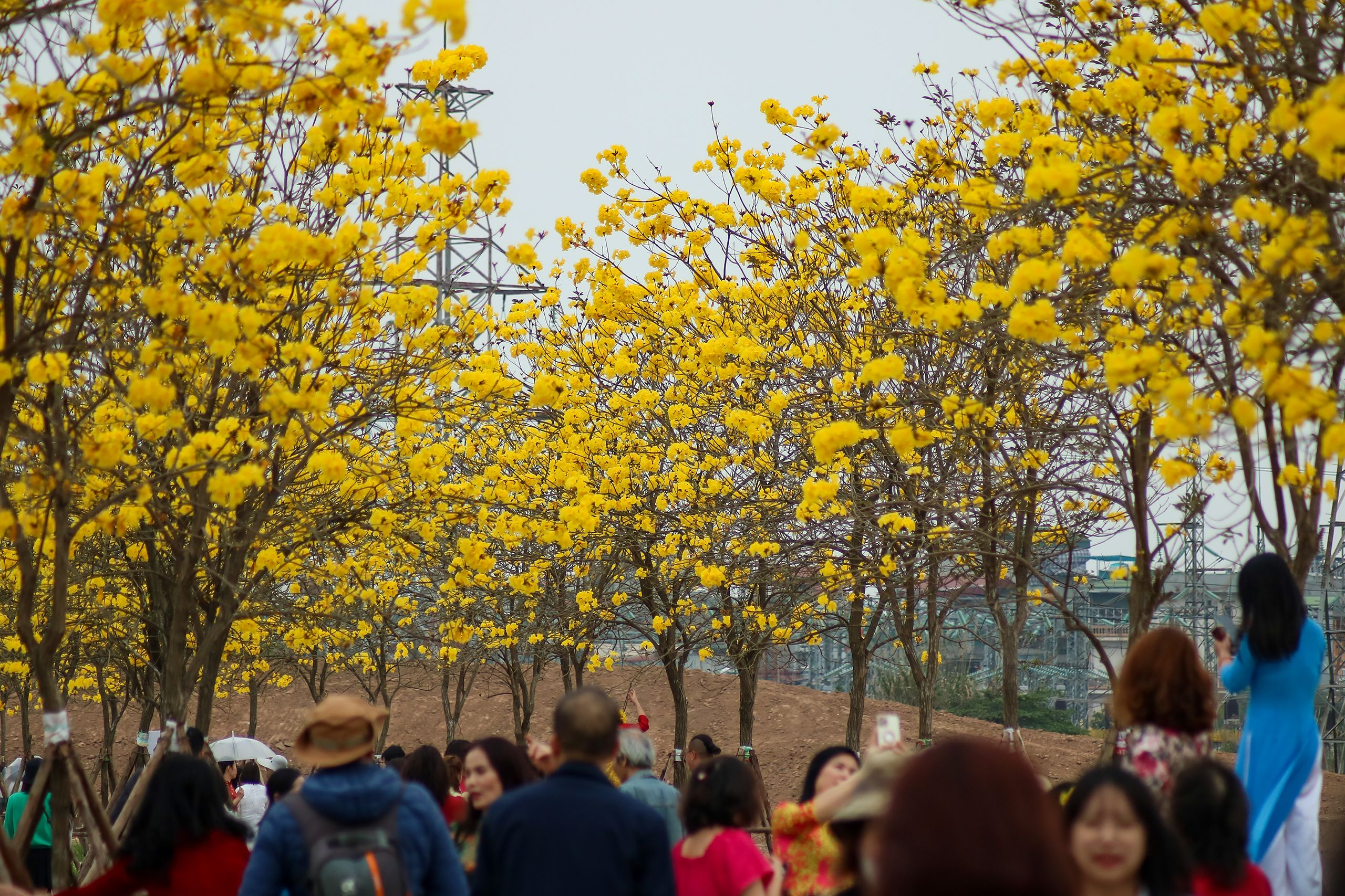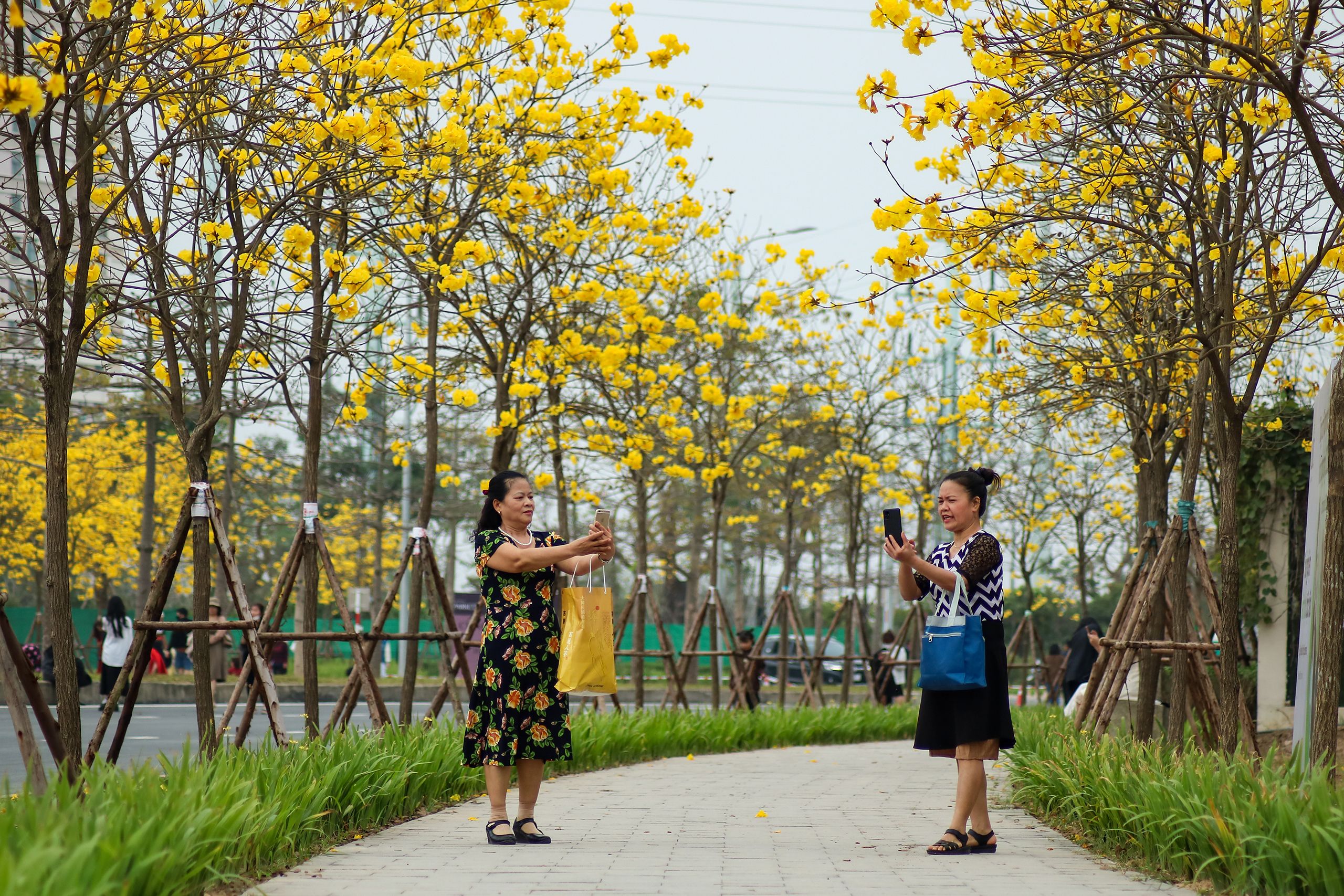 De nombreuses jeunes filles portant l’áo dài (tunique traditionnelle des femmes vietnamiennes) et des promeneurs viennent prendre des photos à côté des rangées d’arbres à trompette des Caraïbes en fleur.