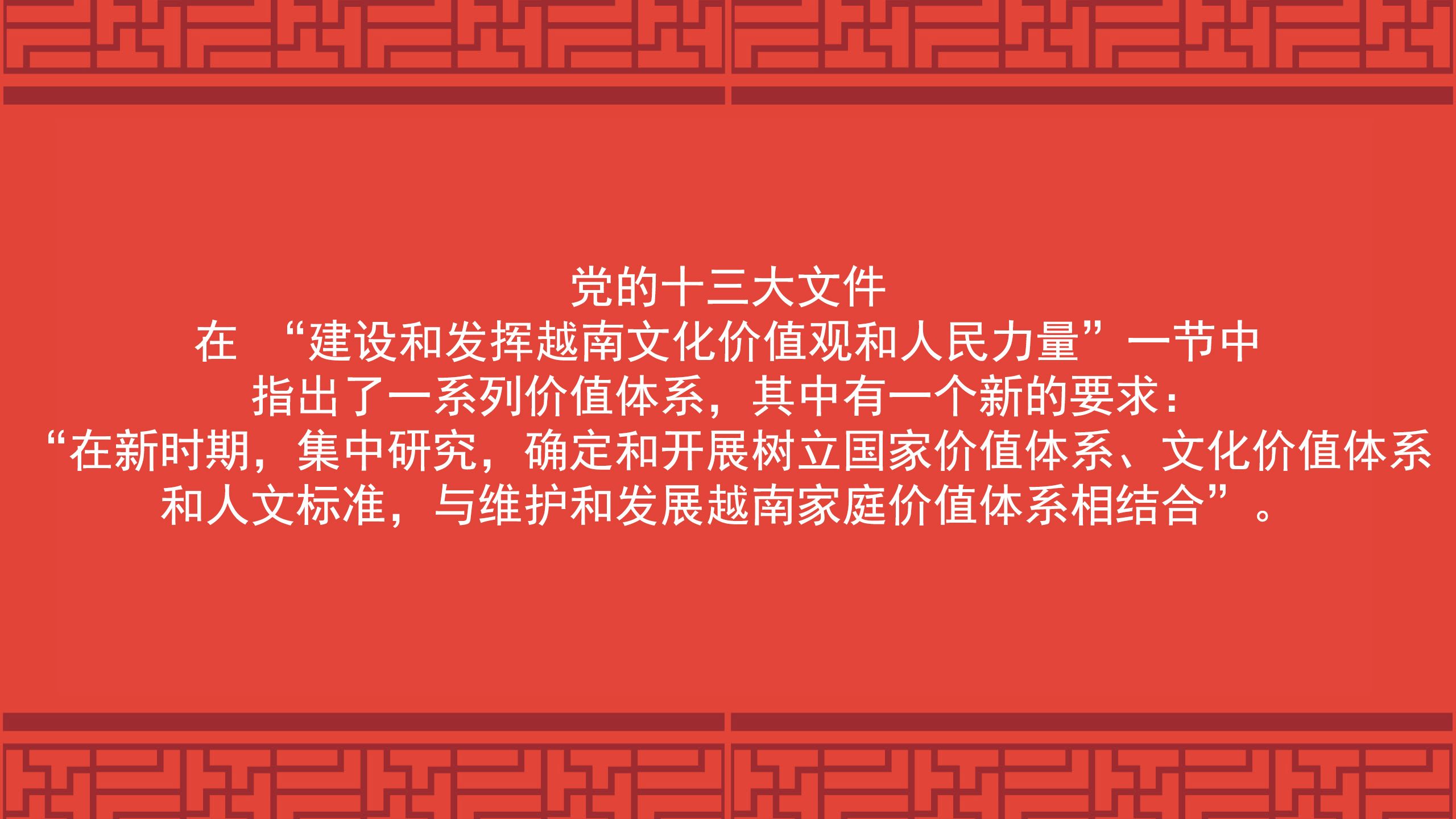 由于上述关系,在确定越南人价值体系的过程中,要同时研究不同的价值体系,形成一个连贯、和谐的体系,一个融入生活的价值尺度,创造一个自觉自愿的群众运动。 为了实现这一目标,文件要求实施所有三个阶段:聚焦研究、确定、开展建立,以在实践中实现这些研究成果。