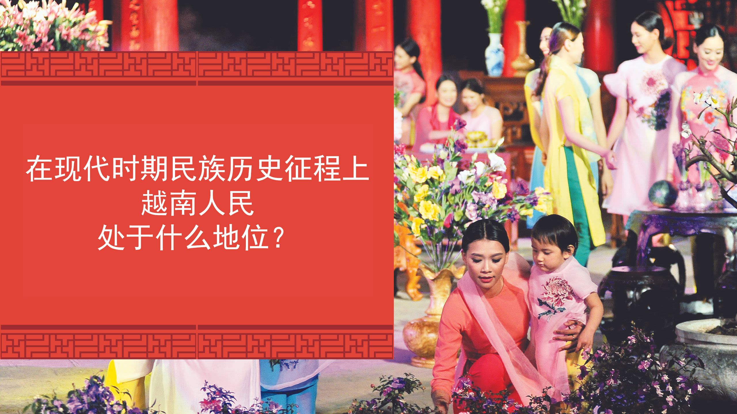 对上述论点的感受让我们了解在一个自过去至现在的特殊历史过程形成、发展和变化的当代越南人。这个特殊是否比如下烙印显示得更突出。那是为建国卫国、扩张国土而坚强斗争的千年历史;那就是抵抗文化同化的图谋与手段、维护民族特色的坚强斗争;那就是截至19世纪封建制度的千年历史。