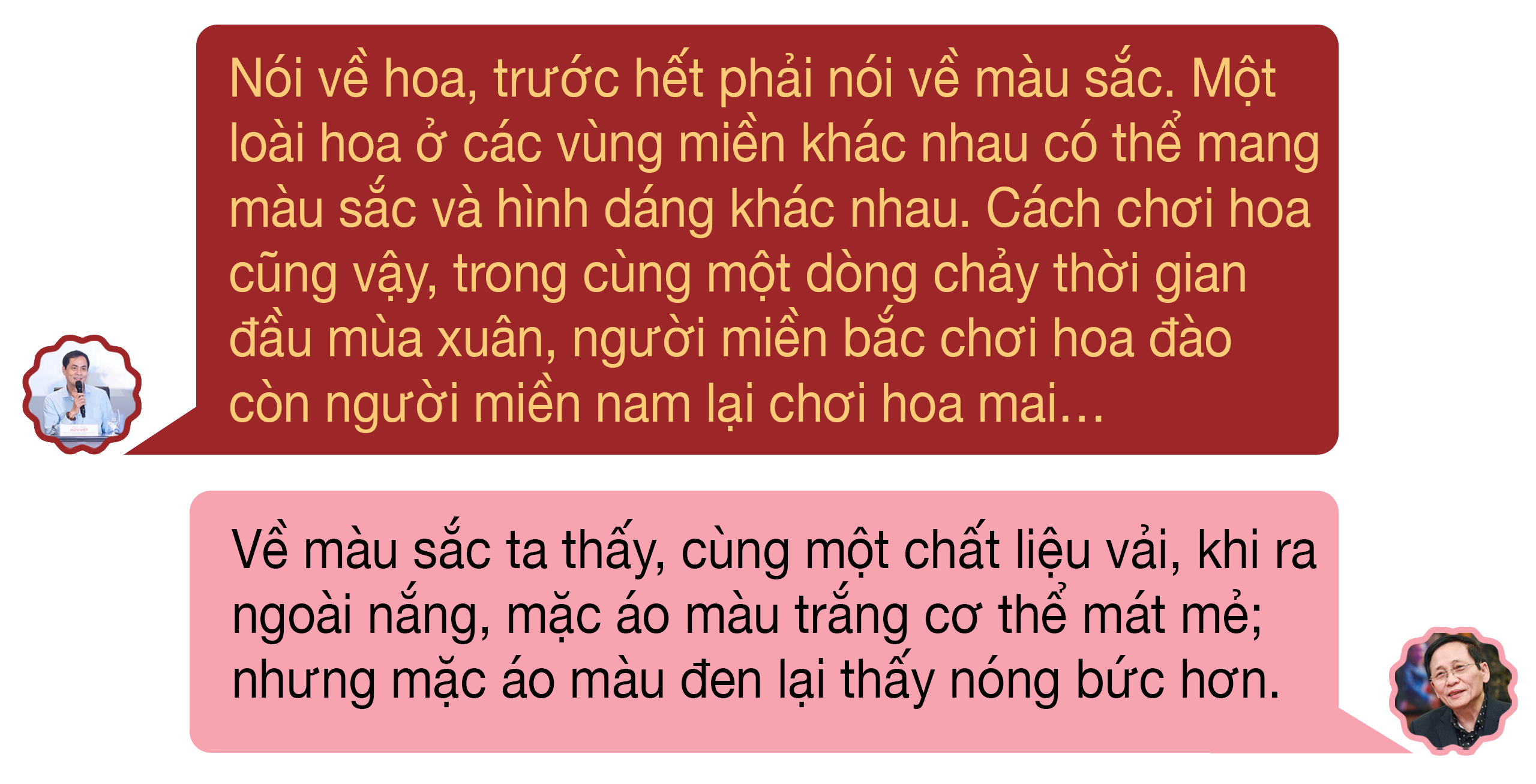 Còn khi bàn về bắc-nam không phải chỉ nói về kinh độ, vĩ độ mà còn là về văn hóa. Thời Bắc thuộc, nước ta nằm ở phía nam của Trung Quốc, tất cả các màu sắc phải dùng theo nguyên lý tương sinh hoặc tương ứng để thu được phát triển lớn mạnh hơn. Theo ngũ hành, phương nam (ly) là hỏa, hỏa khí có vượng thì nước mới thịnh. Trên quan niệm đó, tôi cho rằng tập tục chơi hoa đào bắt đầu từ đây.