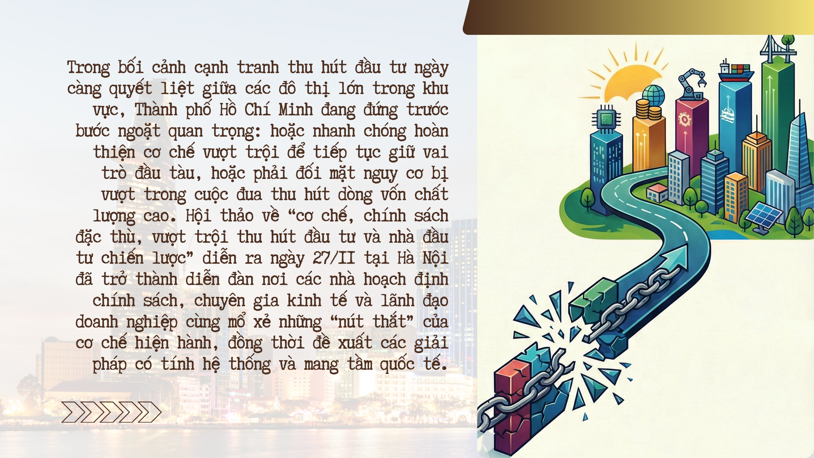 Trong bối cảnh cạnh tranh thu hút vốn quốc tế ngày càng gay gắt, Thành phố Hồ Chí Minh buộc phải chuyển sang thế hệ cơ chế mới: đột phá hơn, linh hoạt hơn, phân quyền mạnh hơn và quan trọng nhất là có năng lực cạnh tranh quốc tế thực sự.