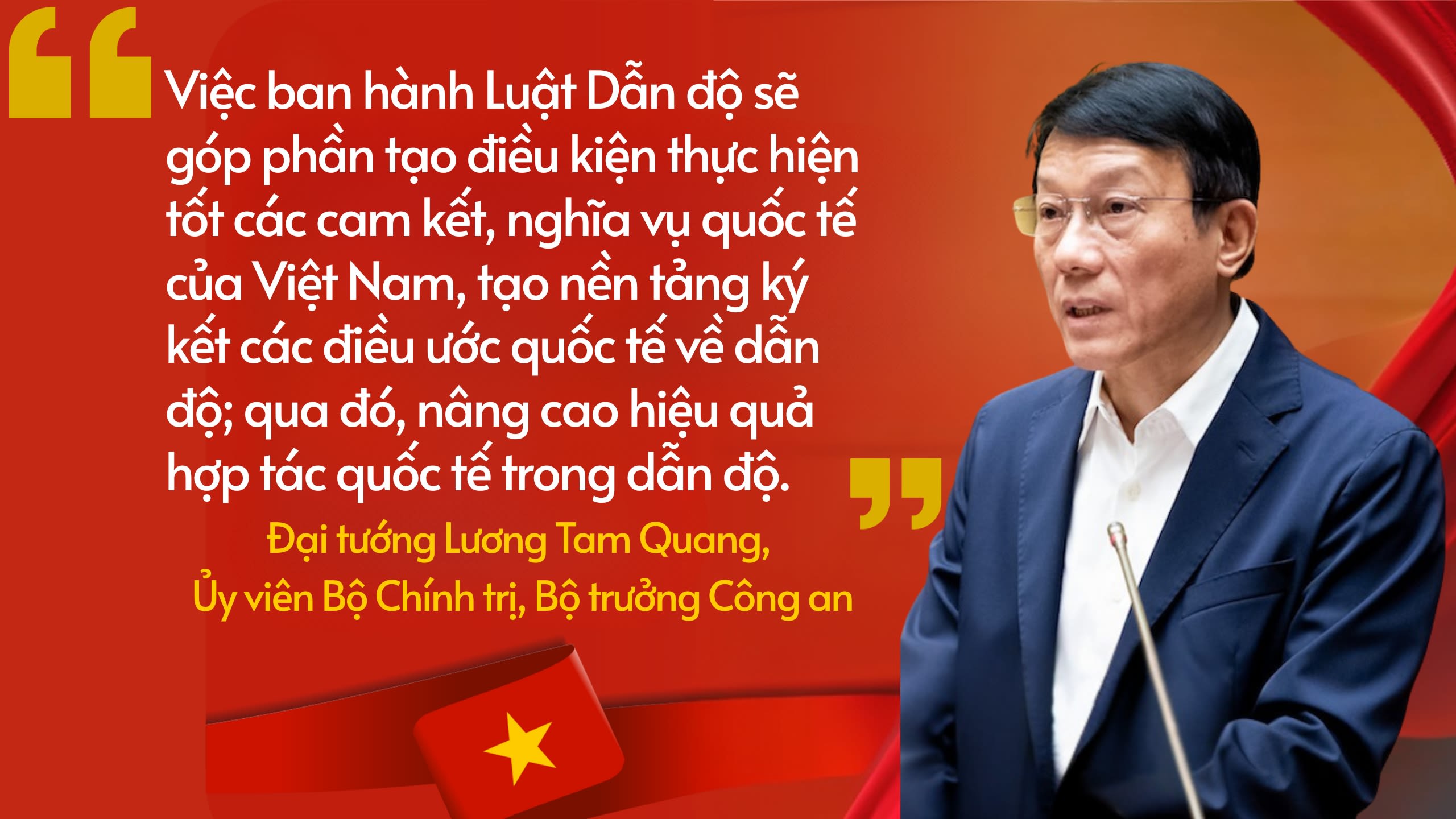 Theo Đại tướng Lương Tam Quang, Ủy viên Bộ Chính trị, Bộ trưởng Công an (cơ quan chủ trì soạn thảo), dự án Luật Dẫn độ nhằm tiếp tục hoàn thiện pháp luật về dẫn độ theo hướng đồng bộ, hiện đại, chặt chẽ, khả thi, phù hợp với pháp luật và thông lệ quốc tế, thúc đẩy hợp tác quốc tế về dẫn độ, nâng cao hiệu quả truy bắt các đối tượng phạm tội bỏ trốn ra nước ngoài hoặc đối tượng người nước ngoài phạm tội lẩn trốn ở nước ta nhằm bảo vệ sự tôn nghiêm của pháp luật, bảo đảm mục tiêu quản lý Nhà nước trong lĩnh vực dẫn độ, tạo nền tảng cho việc ký kết và thực hiện các điều ước quốc tế về dẫn độ.