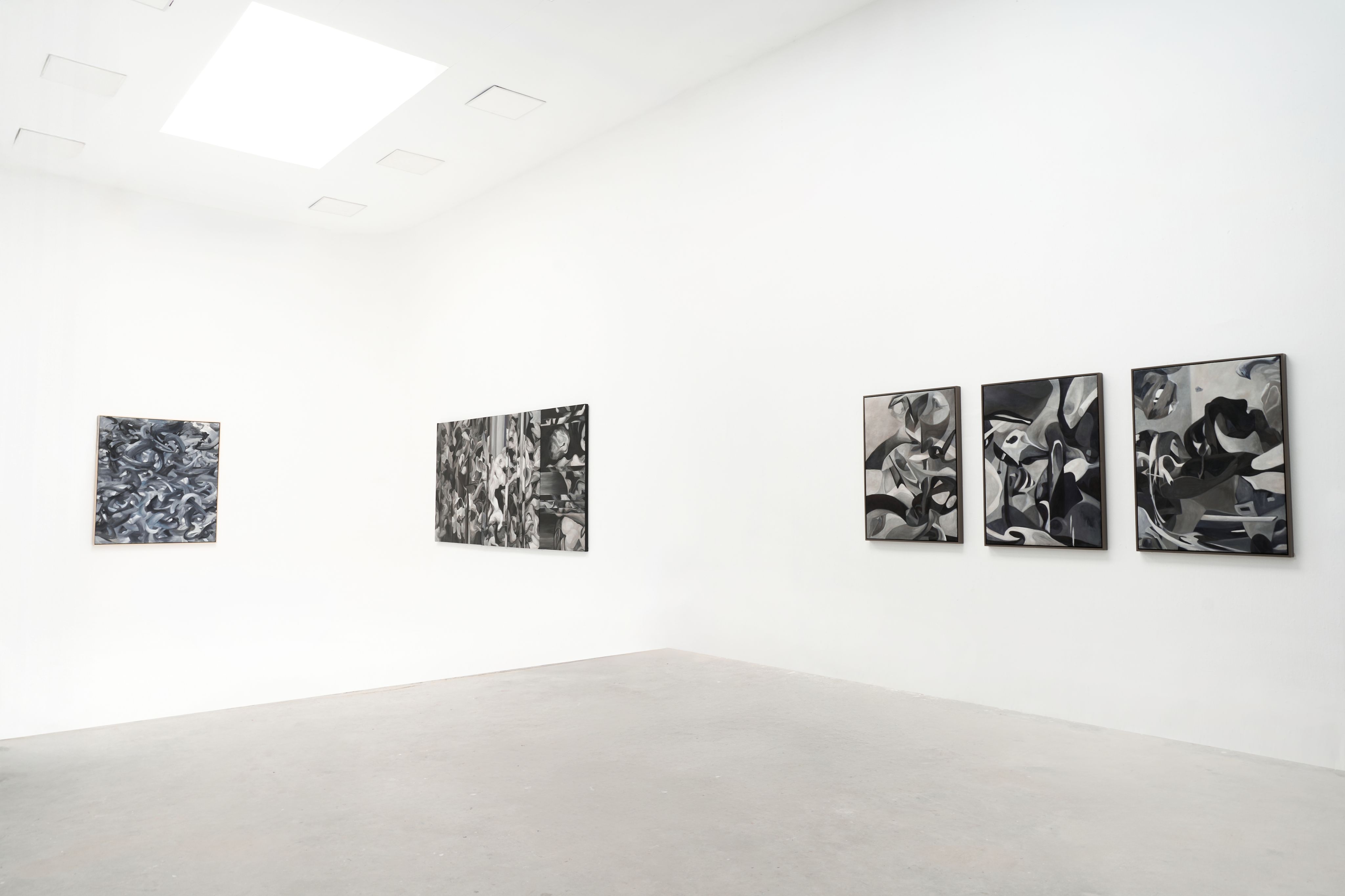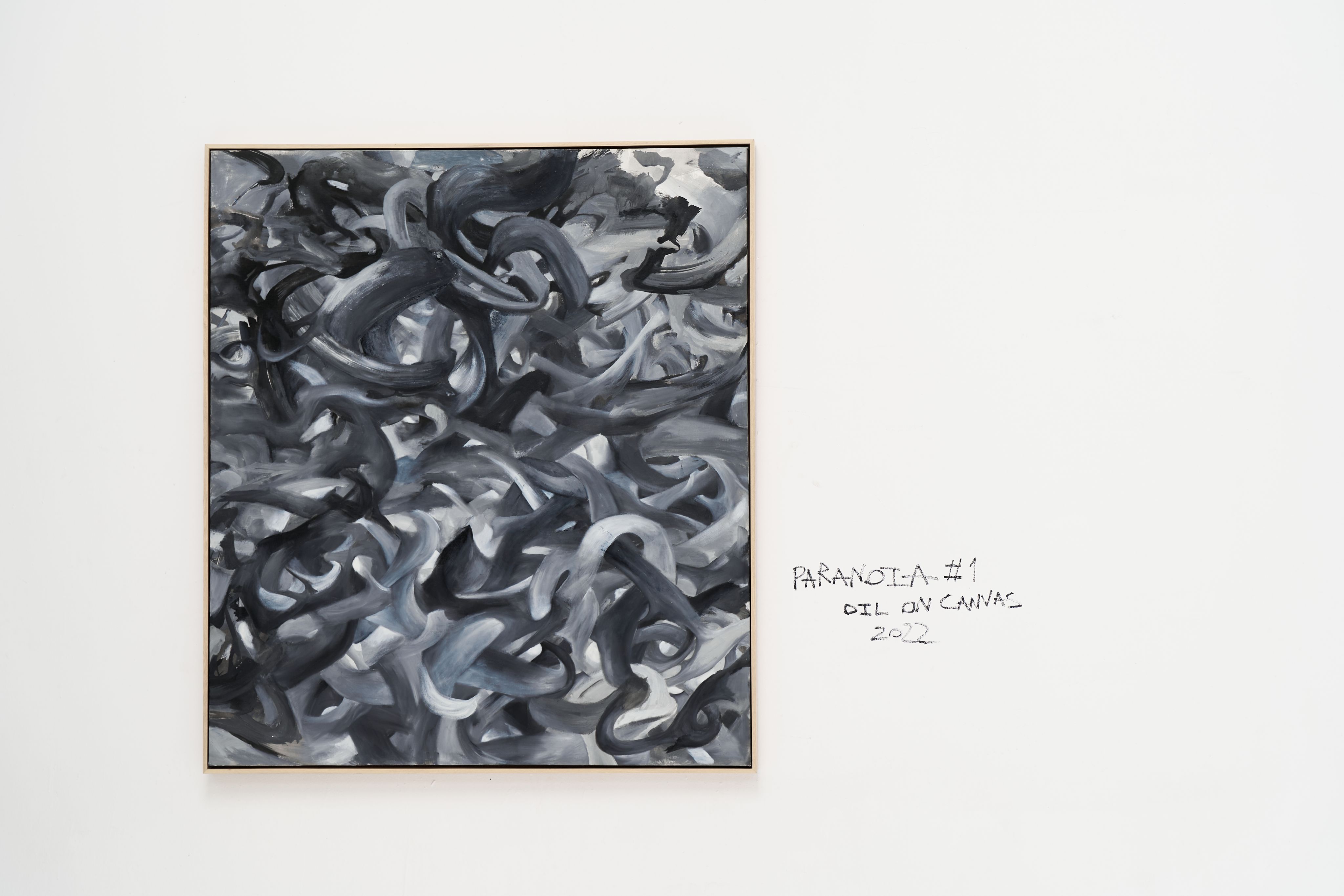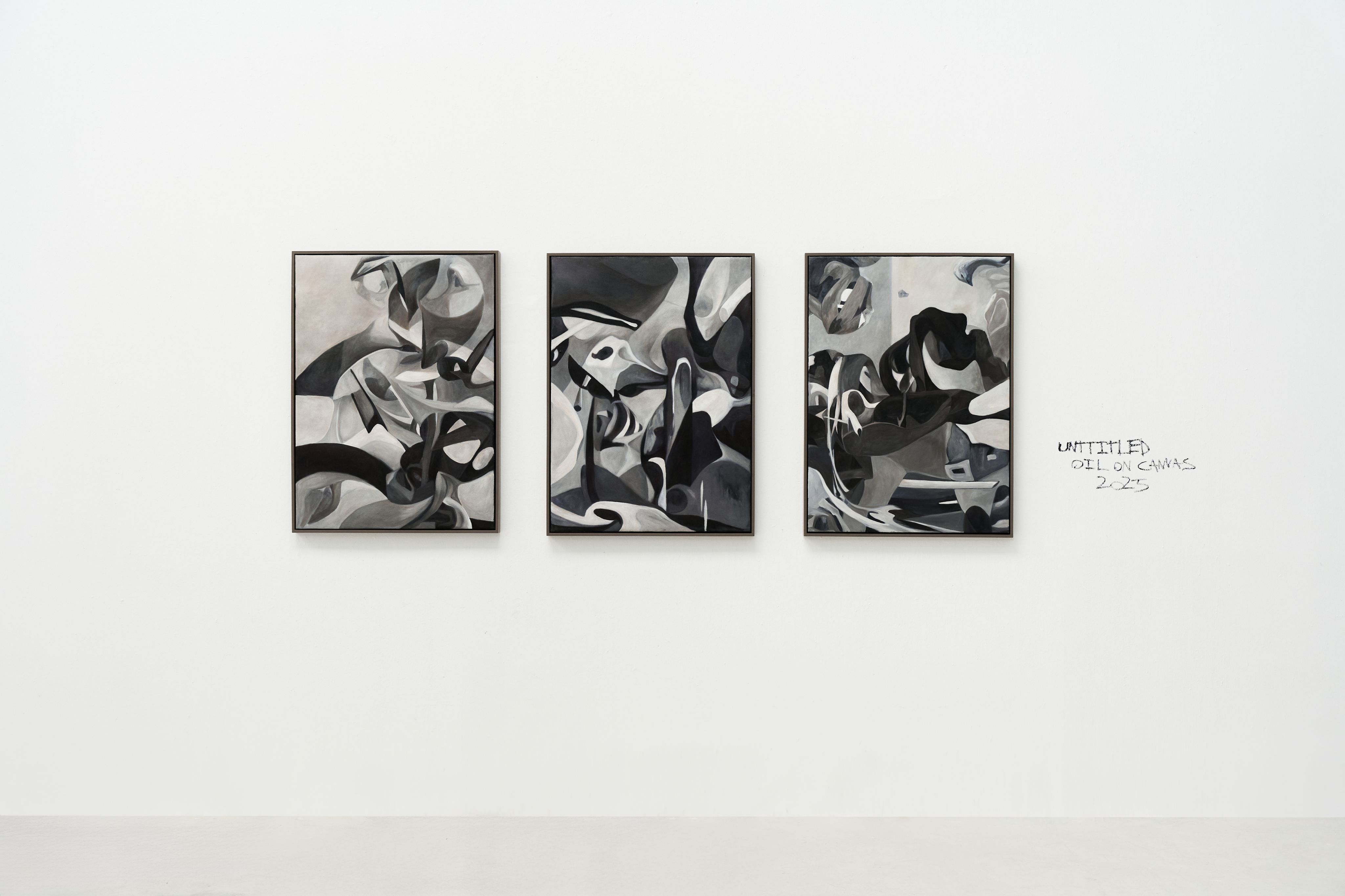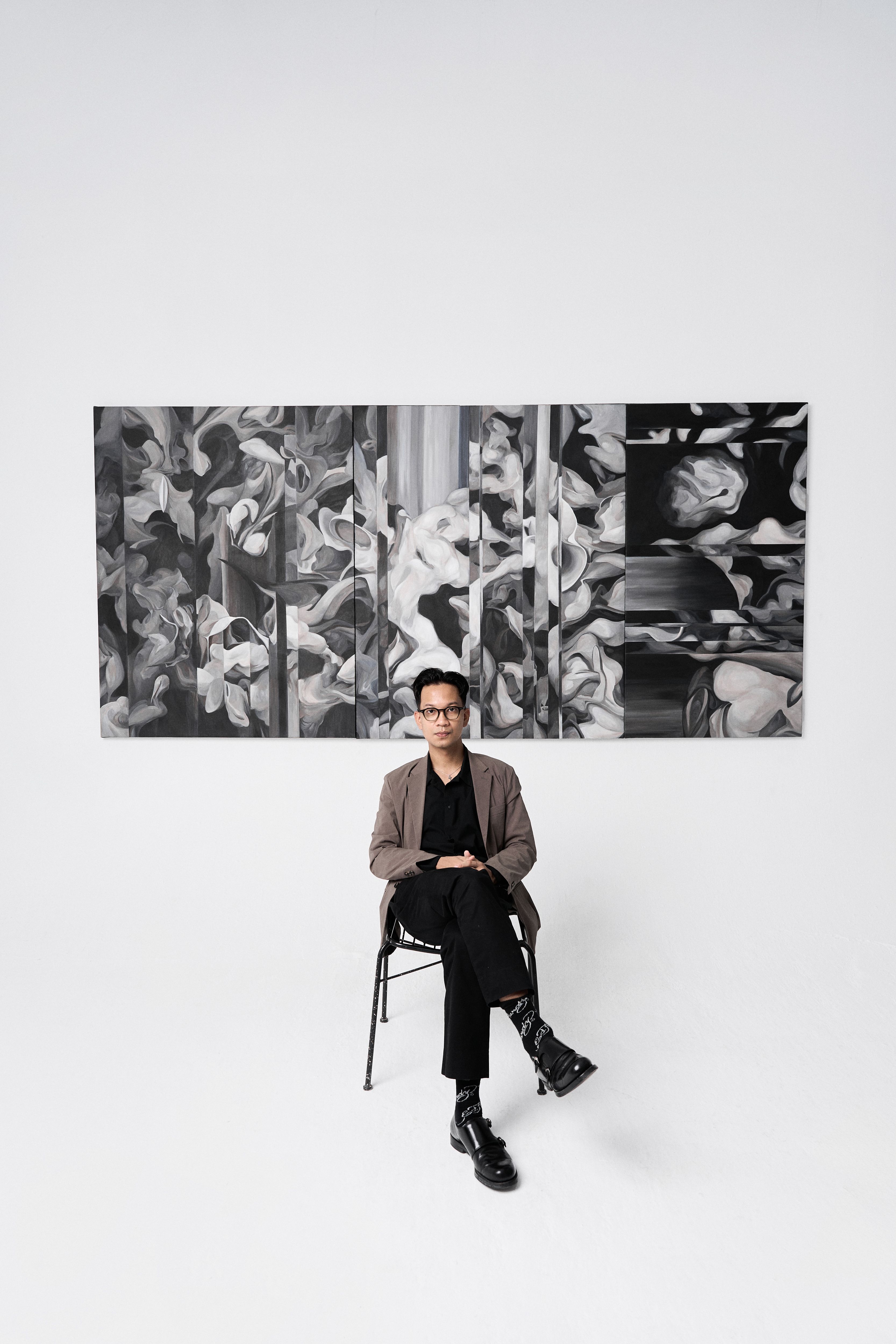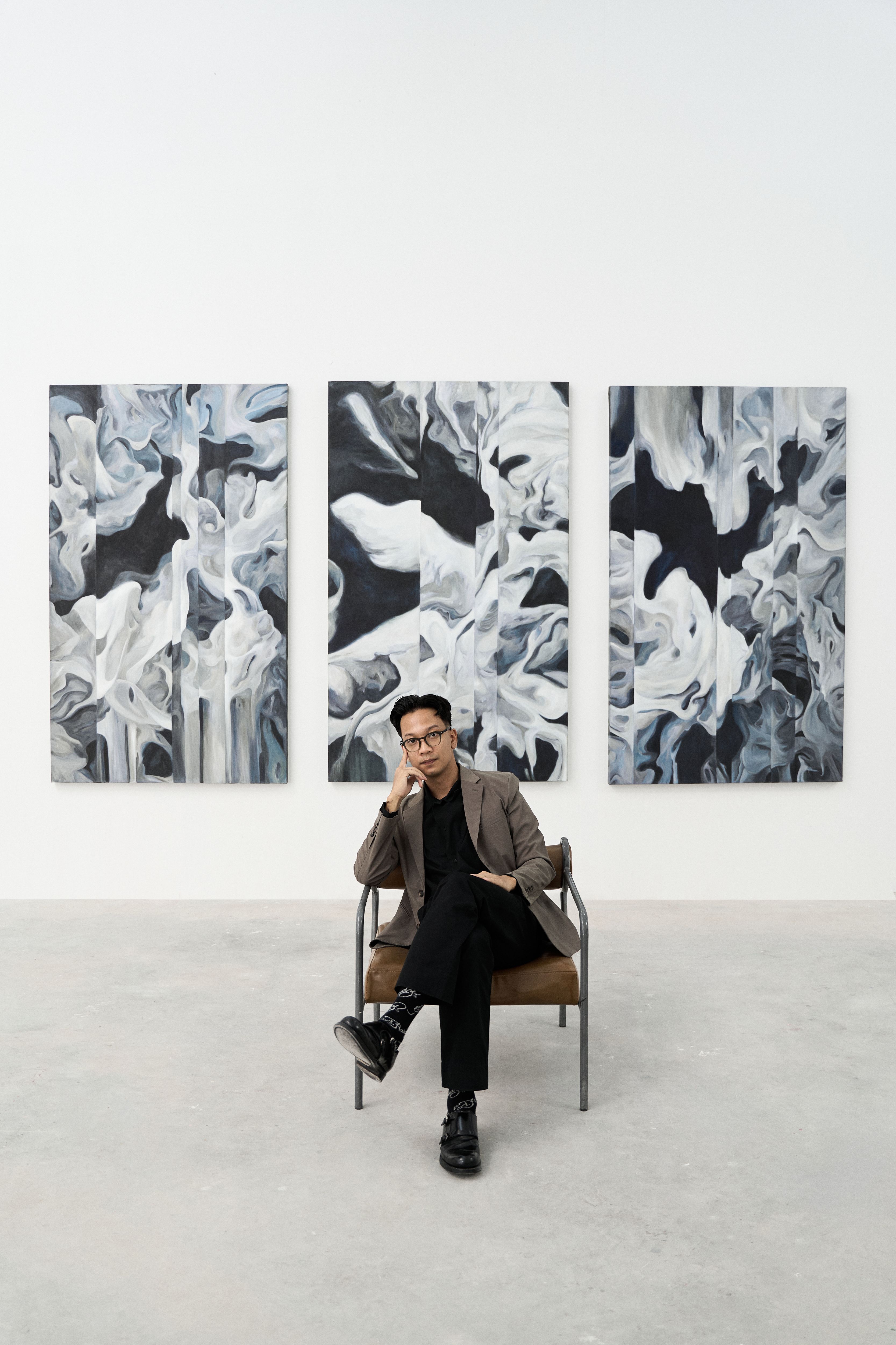 Không gian nghệ thuật với tên gọi “Prologue” của Bách Vũ trưng bày 6 tác phẩm sơn dầu monochrome (gần như đen-trắng hoàn toàn) khổ lớn, gồm tranh đơn và tranh bộ.