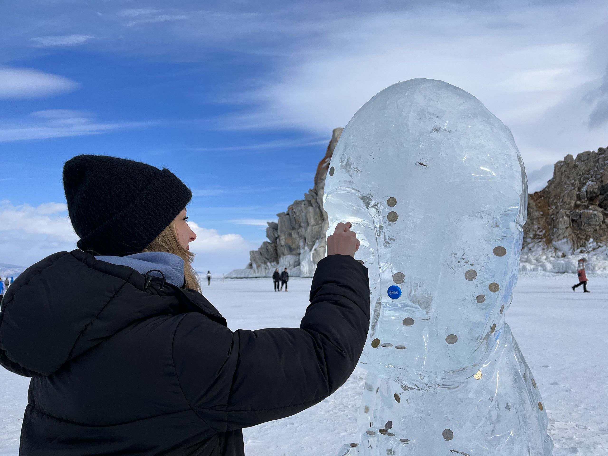 Du khách dán đồng xu lên tượng băng pháp sư sao cho nó không bị rớt xuống, và như thế điều ước sẽ thành hiện thực.
