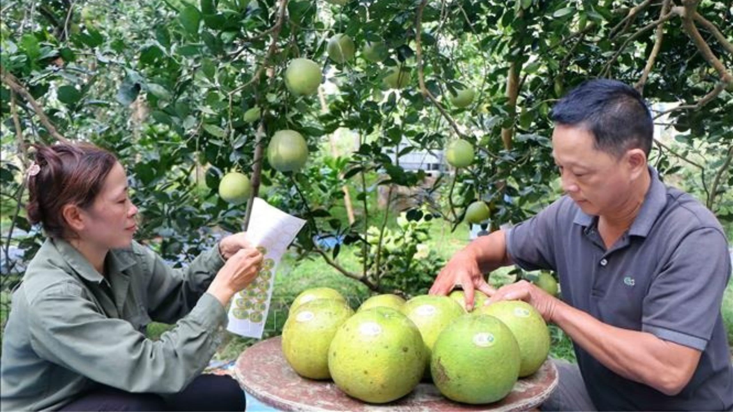 Vợ chồng chị Phạm Thị Thêm tại khu Chí, xã Chí Đám (Đoan Hùng, Phú Thọ) dán tem truy xuất nguồn gốc lên sản phẩm bưởi Sửu trước khi đưa đi ra thị trường tiêu thụ. Ảnh: TTXVN