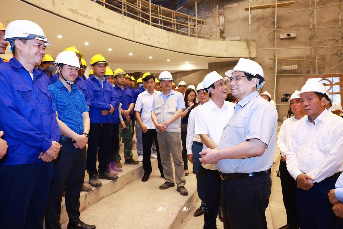 Thủ tướng Phạm Minh Chính kiểm tra tiến độ thi công và công trình Nhà Văn hóa nghệ thuật tỉnh Phú Thọ (4/2024). Ảnh: TTXVN