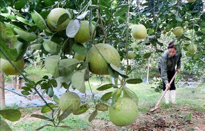 Chị Phạm Thị Thêm chăm sóc vườn bưởi Sửu trồng theo tiêu chuẩn VietGap tại khu Chí, xã Chí Đám (Đoan Hùng, Phú Thọ). Ảnh: TTXVN