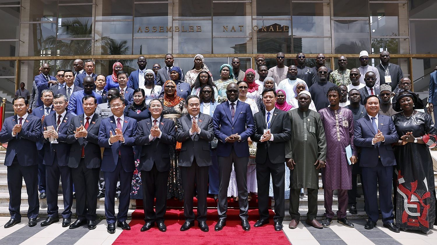 Chủ tịch Quốc hội Trần Thanh Mẫn và Chủ tịch Quốc hội Senegal Malick Ndiaye chụp ảnh chung với thành viên hai đoàn. (Ảnh: TTXVN)