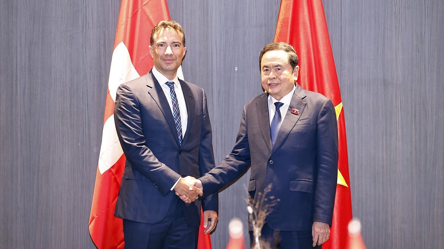 Chủ tịch Quốc hội Trần Thanh Mẫn hội kiến Chủ tịch Thượng viện Thụy Sĩ Andrea Caroni. (Ảnh: TTXVN)