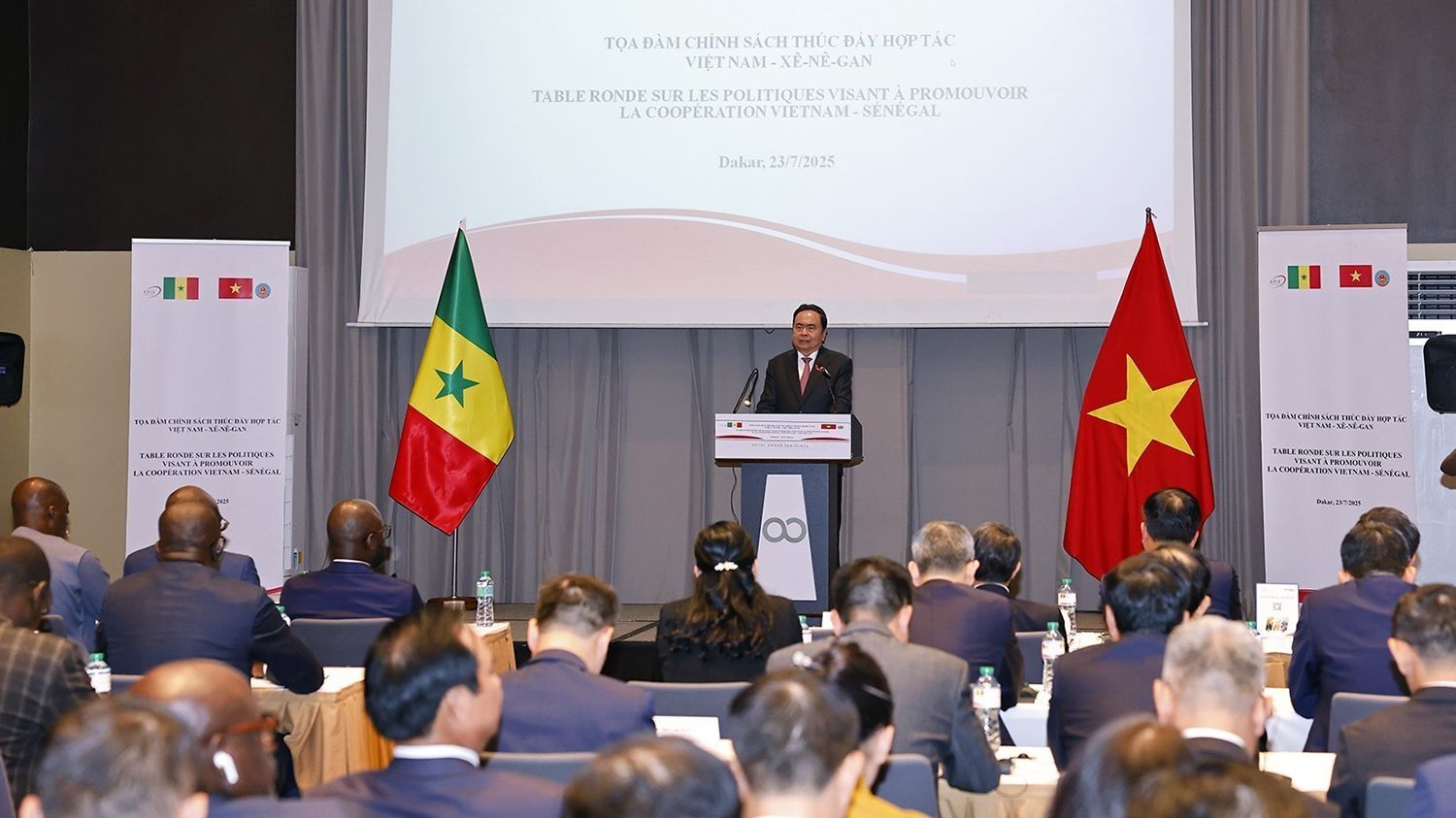 Tại thủ đô Dakar, Chủ tịch Quốc hội Trần Thanh Mẫn và Chủ tịch Quốc hội Senegal dự Tọa đàm chính sách thúc đẩy hợp tác Việt Nam-Senegal, sự kiện quan trọng nhằm thúc đẩy hợp tác kinh tế, thương mại và đầu tư giữa hai nước. Phát biểu tại tọa đàm, Chủ tịch Quốc hội Trần Thanh Mẫn cho rằng, lợi thế, tiềm năng hợp tác giữa hai nước là rất lớn. Việt Nam có nhiều thế mạnh có thể hợp tác với Senegal, nhất là trong lĩnh vực nông nghiệp, viễn thông, hạ tầng số, khai khoáng, nuôi trồng thủy sản, xây dựng, đầu tư hạ tầng cơ sở.