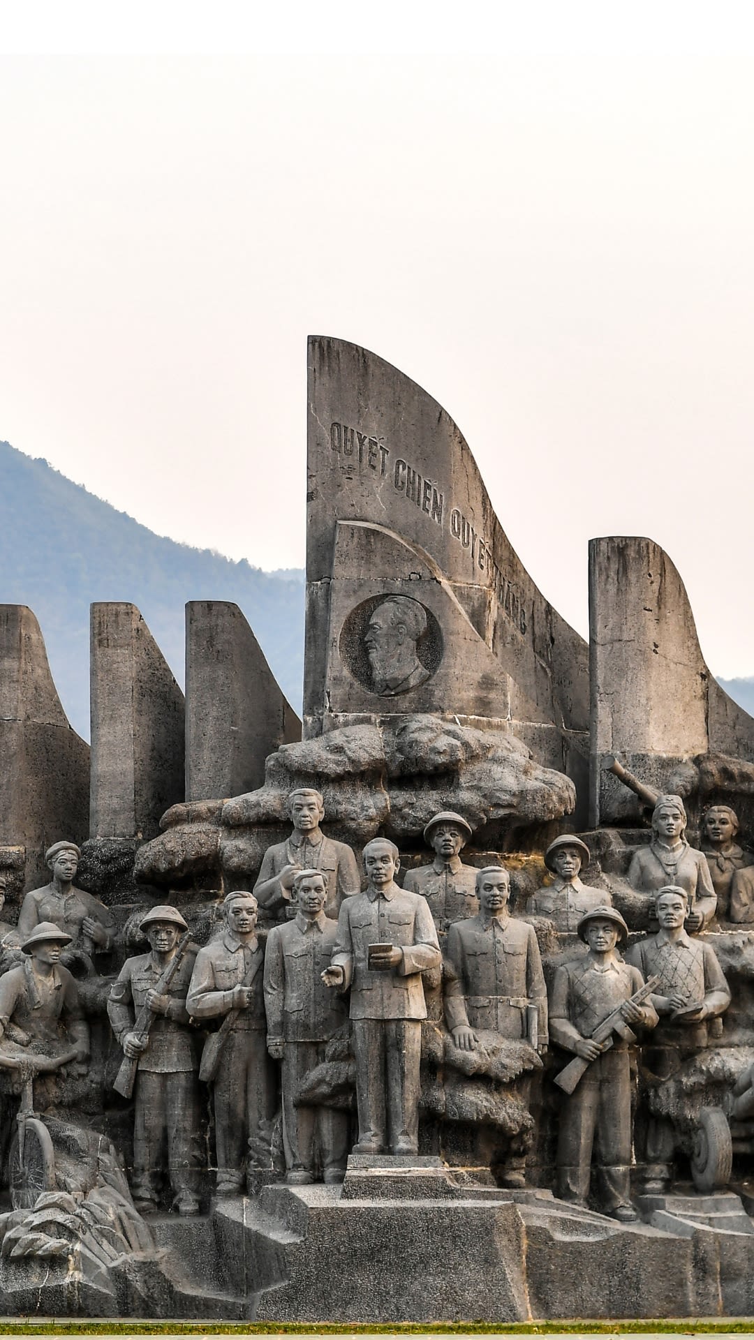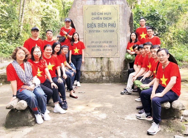 Du khách chụp ảnh tại bia Di tích Sở Chỉ huy Chiến dịch Điện Biên Phủ tại Mường Phăng (Điện Biên). Ảnh: LINH HỒNG