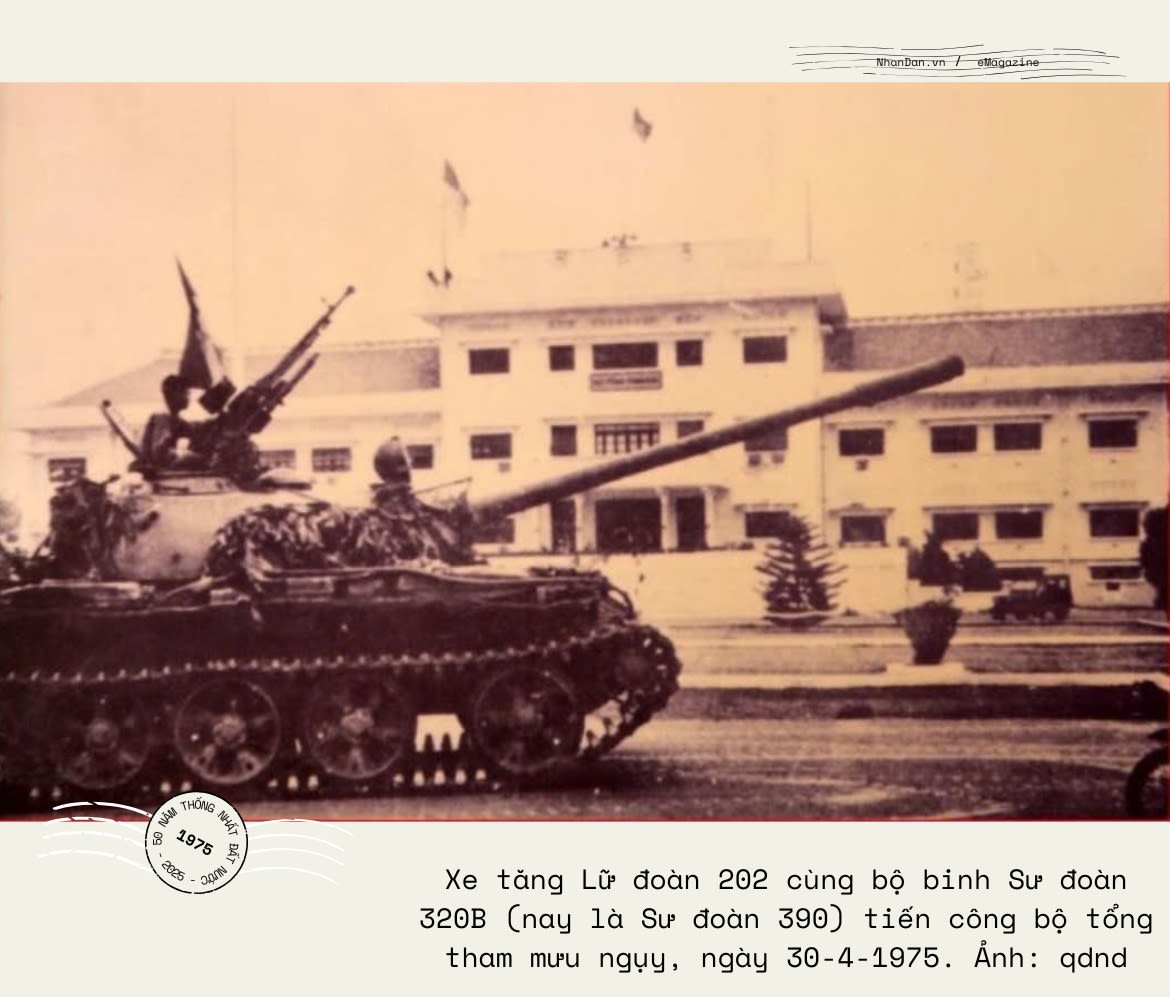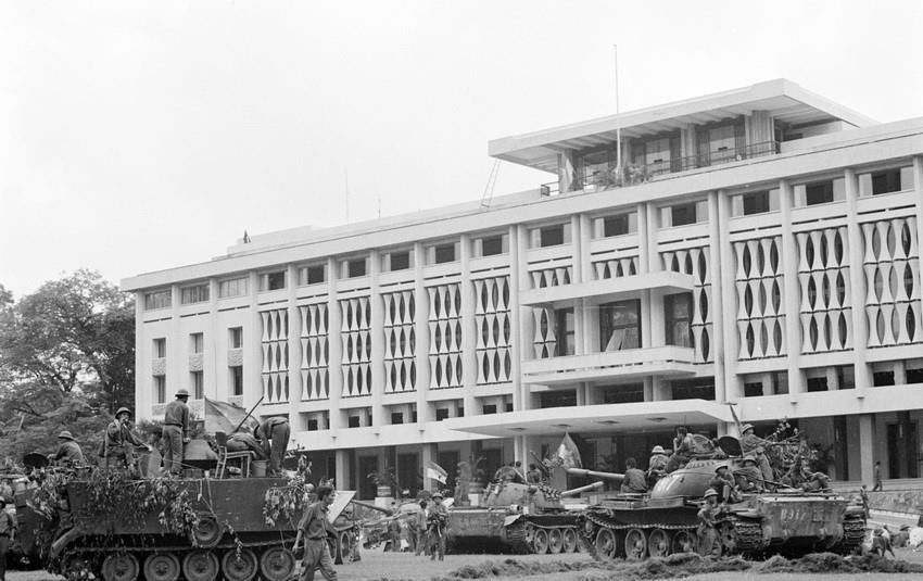 Xe tăng và bộ binh quân giải phóng chiếm phủ Tổng thống ngụy quyền Sài Gòn, trưa 30/4/1975. (Ảnh: Mai Hưởng/TTXVN)