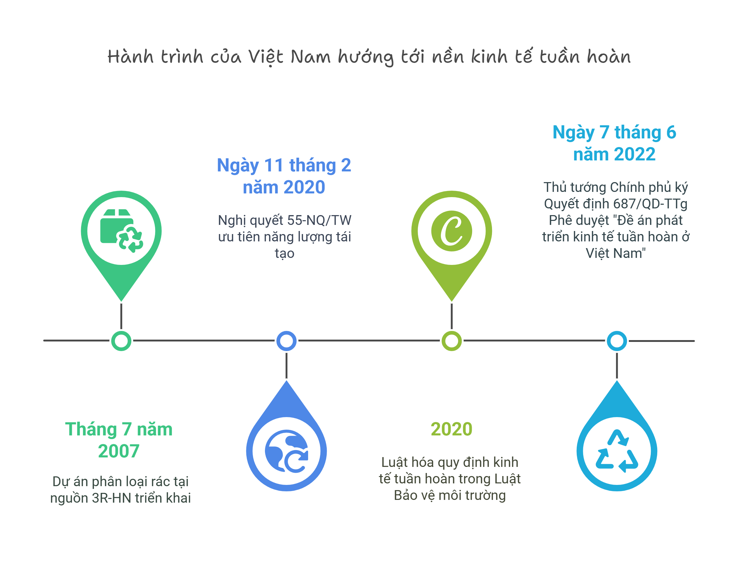 Luật Bảo vệ môi trường năm 2020 chính thức luật hóa quy định về kinh tế tuần hoàn. Nghị quyết Đại hội lần thứ XIII của Đảng khẳng định chủ trương “xây dựng nền kinh tế xanh, kinh tế tuần hoàn, thân thiện với môi trường”, “Xây dựng lộ trình, cơ chế, chính sách, pháp luật để hình thành, vận hành mô hình kinh tế tuần hoàn”.