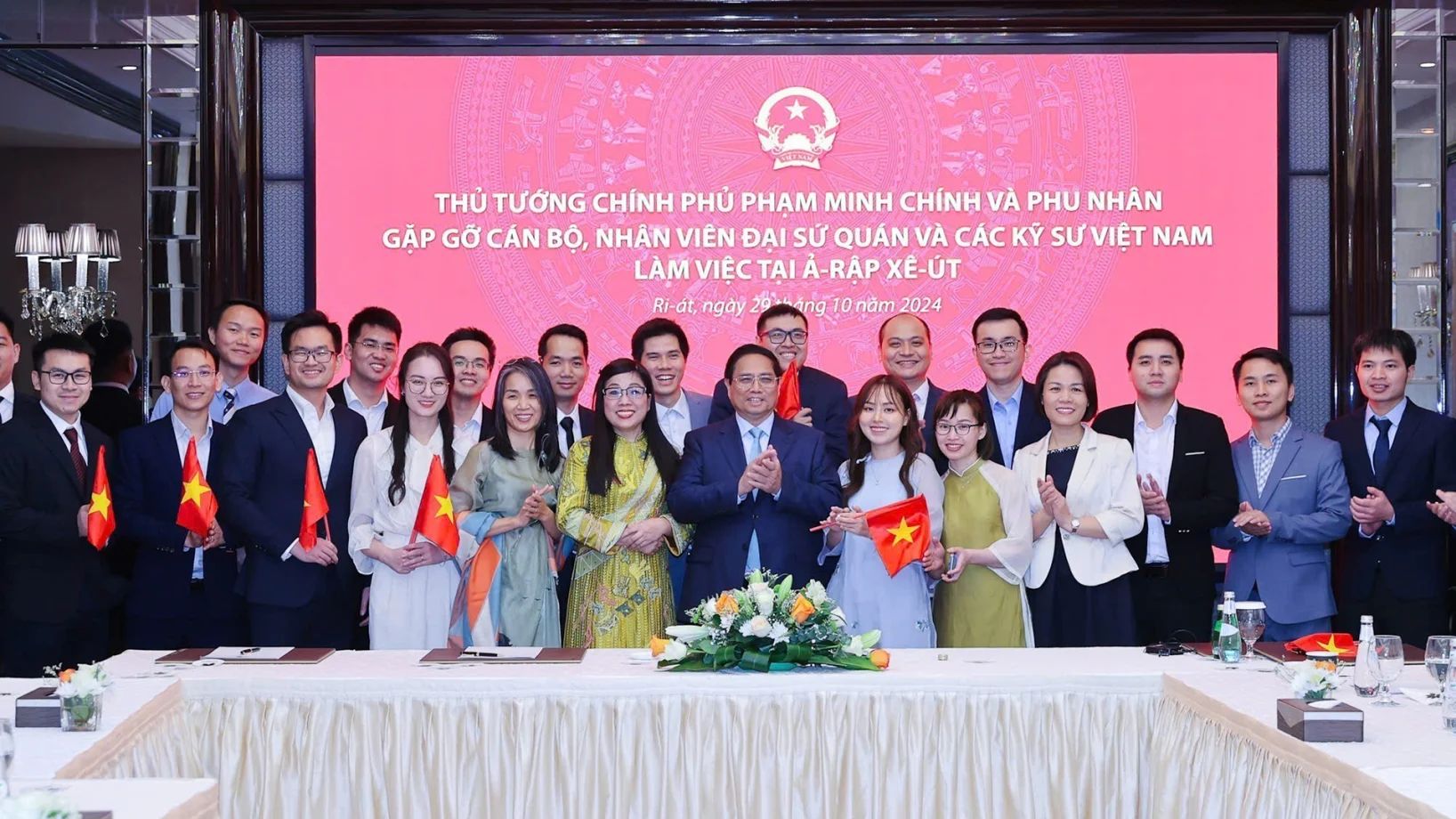 Премьер-министр Вьетнама Фам Минь Тьинь с супругой на встрече с сотрудниками Посольства Вьетнама и инженерами, работающими в Саудовской Аравии. Фото: ВИА