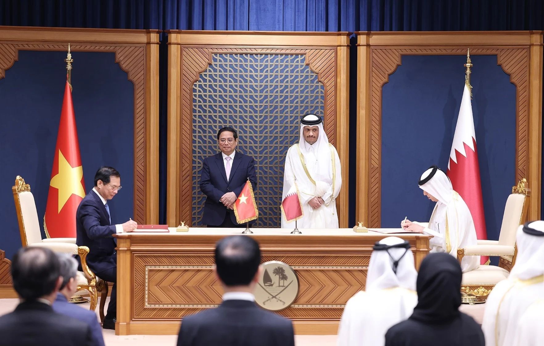 По этому случаю Премьер-министр Фам Минь Тьинь и Премьер-министр Катара шейх Мохаммед бин Абдулрахман Аль Тани присутствовали на церемонии подписания документов о сотрудничестве между министерствами, ведомствами, учреждениями двух стран, включая Протокол между Правительством Государства Катар и Правительством СРВ о внесении изменений в Соглашение между ними о воздушном транспорте, подписанное 8 марта 2009 г., Меморандум о взаимопонимании в области спорта между Правительством СРВ и Правительством Государства Катар, Меморандум о взаимопонимании по вопросам сотрудничества в области права между Министерством юстиции СРВ и Министерством юстиции Государства Катар, Меморандум о взаимопонимании по вопросам сотрудничества между Дипломатической академией Вьетнама при МИД СРВ и Дипломатической академией МИД Государства Катар, Меморандум о взаимопонимании по вопросам сотрудничества в области инвестиций между Государственной корпорацией капитальных инвестиций (SCIC) и Катарским инвестиционным фондом.