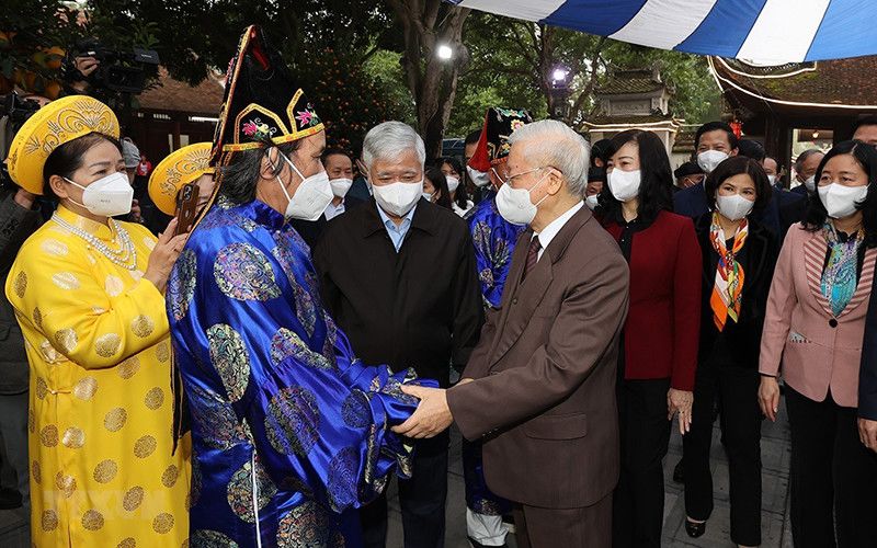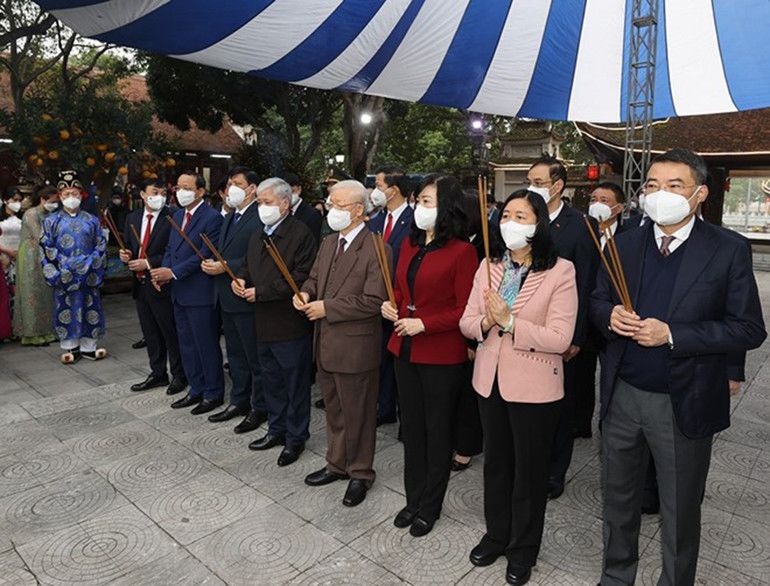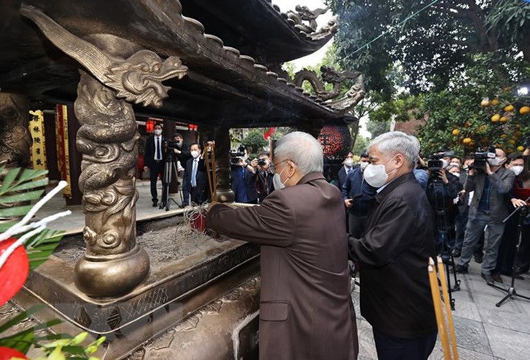 Tổng Bí thư Nguyễn Phú Trọng thăm Di tích lịch sử-văn hóa Đền Đô (phường Đình Bảng, thành phố Từ Sơn). (Ảnh: Trí Dũng/TTXVN)