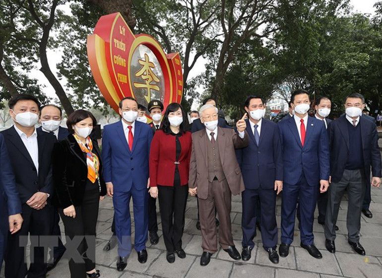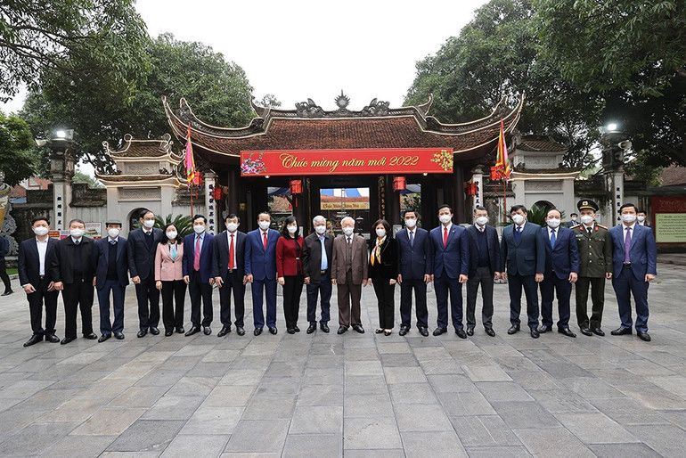 Tổng Bí thư Nguyễn Phú Trọng với các đại biểu tại Di tích lịch sử-văn hóa Đền Đô (phường Đình Bảng, thành phố Từ Sơn). (Ảnh: Trí Dũng/TTXVN)