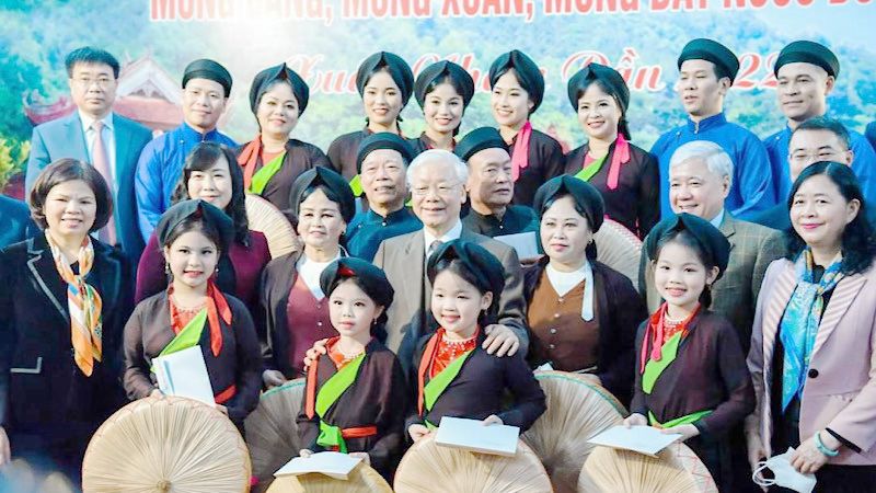 Tổng Bí thư Nguyễn Phú Trọng chụp ảnh kỷ niệm với các liền anh, liền chị quan họ.
