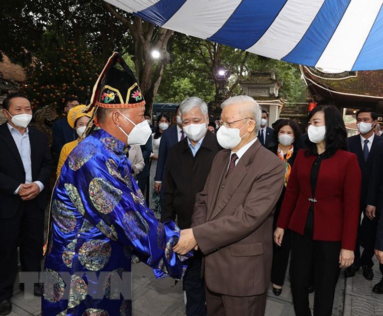 Tổng Bí thư Nguyễn Phú Trọng với nhân dân tại Di tích lịch sử-văn hóa Đền Đô (phường Đình Bảng, thành phố Từ Sơn). (Ảnh: Trí Dũng/TTXVN)