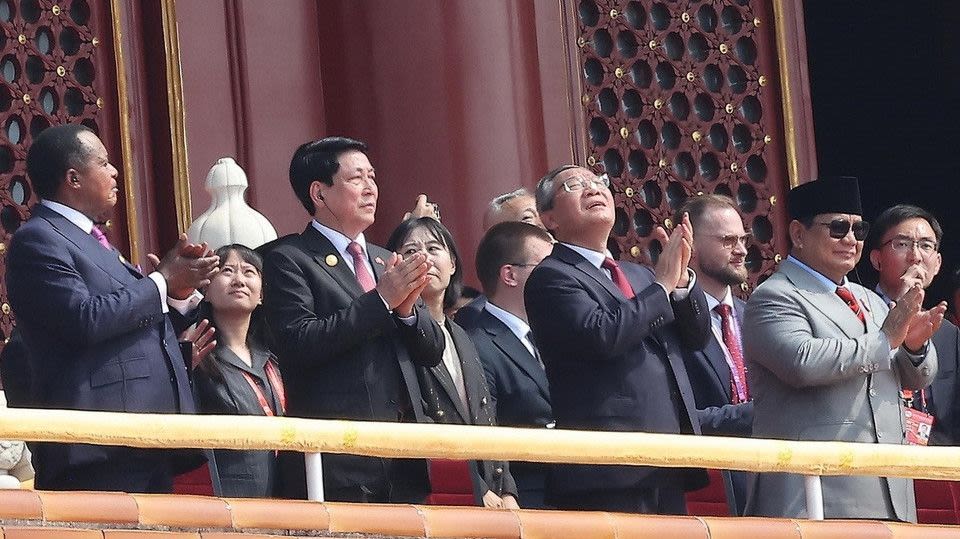 Президент Лыонг Кыонг вместе с лидерами других стран принимает участие в церемонии празднования 80-летия победы народов мира над фашизмом на площади Тяньаньмэнь в Пекине, 3 сентября 2025 года. Фото: ВИА