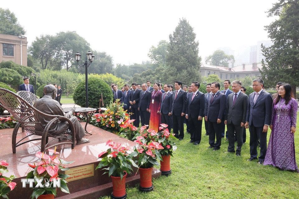 Президент Лыонг Кыонг возлагает цветы в память о Президенте Хо Ши Мине у памятника великому лидеру на территории Посольства Вьетнама в Китае. Фото: ВИА