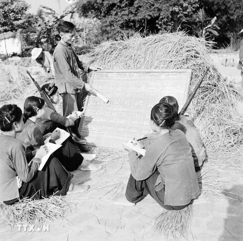 Hưởng ứng phong trào 3 đảm nhiệm, các chị em phụ nữ xã Đức Hợp (Kim Động, Hưng Yên) tham gia học lớp đào tạo bồi dưỡng về nghiệp vụ kỹ thuật cày bừa, tập quân sự, bảo vệ trị an xóm làng (1965). Ảnh: Hữu Ngôi/TTXVN