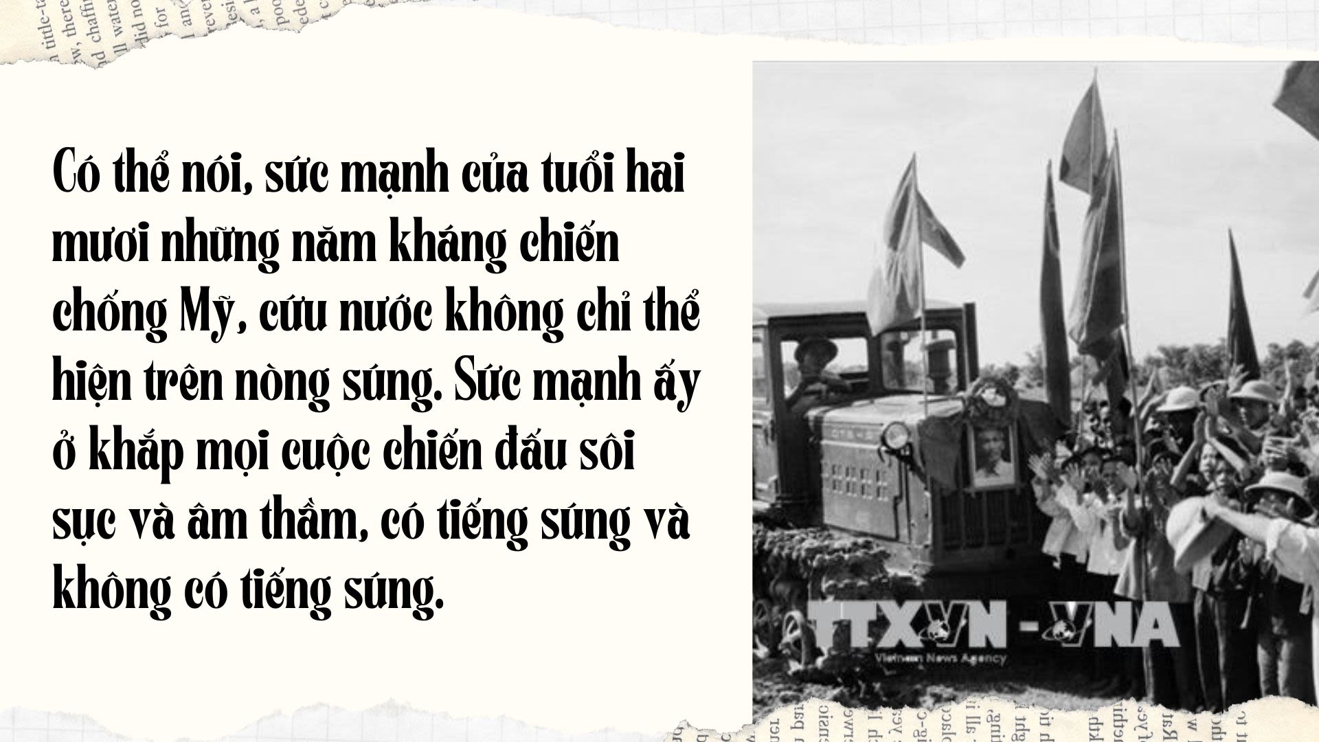Có thể nói, sức mạnh của tuổi hai mươi những năm kháng chiến chống Mỹ, cứu nước không chỉ thể hiện trên nòng súng. Sức mạnh ấy ở khắp mọi cuộc chiến đấu sôi sục và âm thầm, có tiếng súng và không có tiếng súng. Với phong trào tình nguyện “Ba sẵn sàng” phát triển sâu rộng khắp nơi trên miền bắc hòa nhịp với phong trào thi đua “Năm xung phong” của thanh niên miền nam, các thế hệ thanh niên giương cao ngọn cờ chủ nghĩa yêu nước và chủ nghĩa anh hùng cách mạng. Các phong trào thi đua đã tạo ra động lực to lớn, phát huy mạnh mẽ tinh thần lao động xã hội chủ nghĩa để đóng góp cho công cuộc xây dựng chủ nghĩa xã hội ở miền bắc, góp sức người, sức của cho công cuộc giải phóng miền nam.