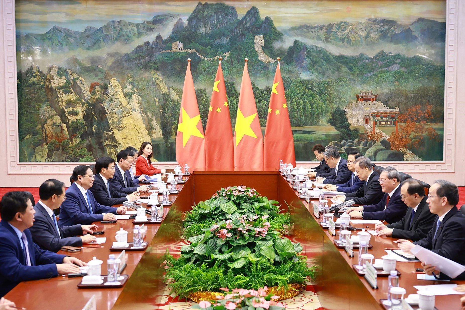 2025年6月24日,在出席在中国天津出席世界经济论坛第十六届新领军者年会并开展各项活动期间,越南政府总理范明正与中国国务院总理李强举行会谈。(图片来源:越通社)
